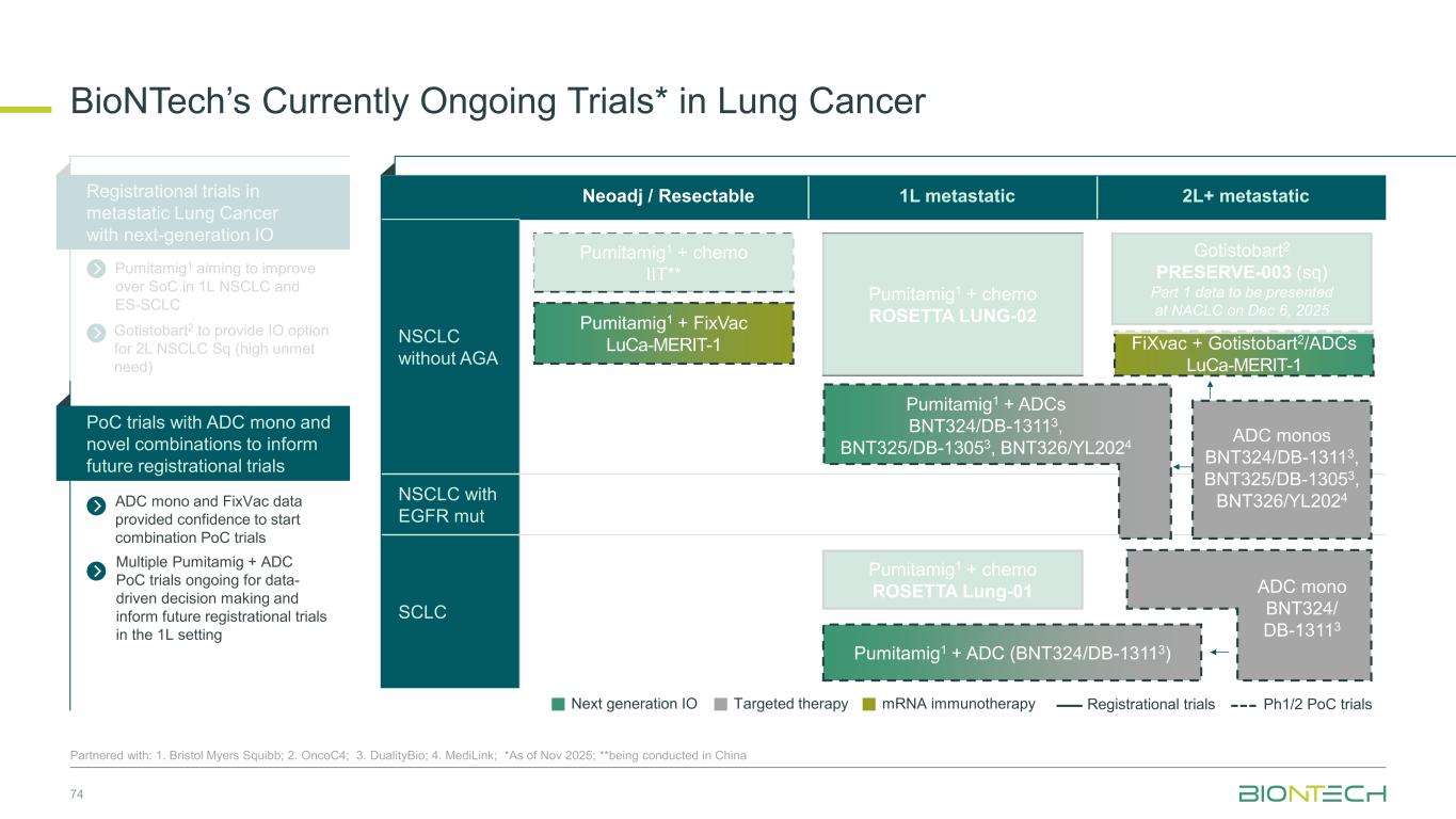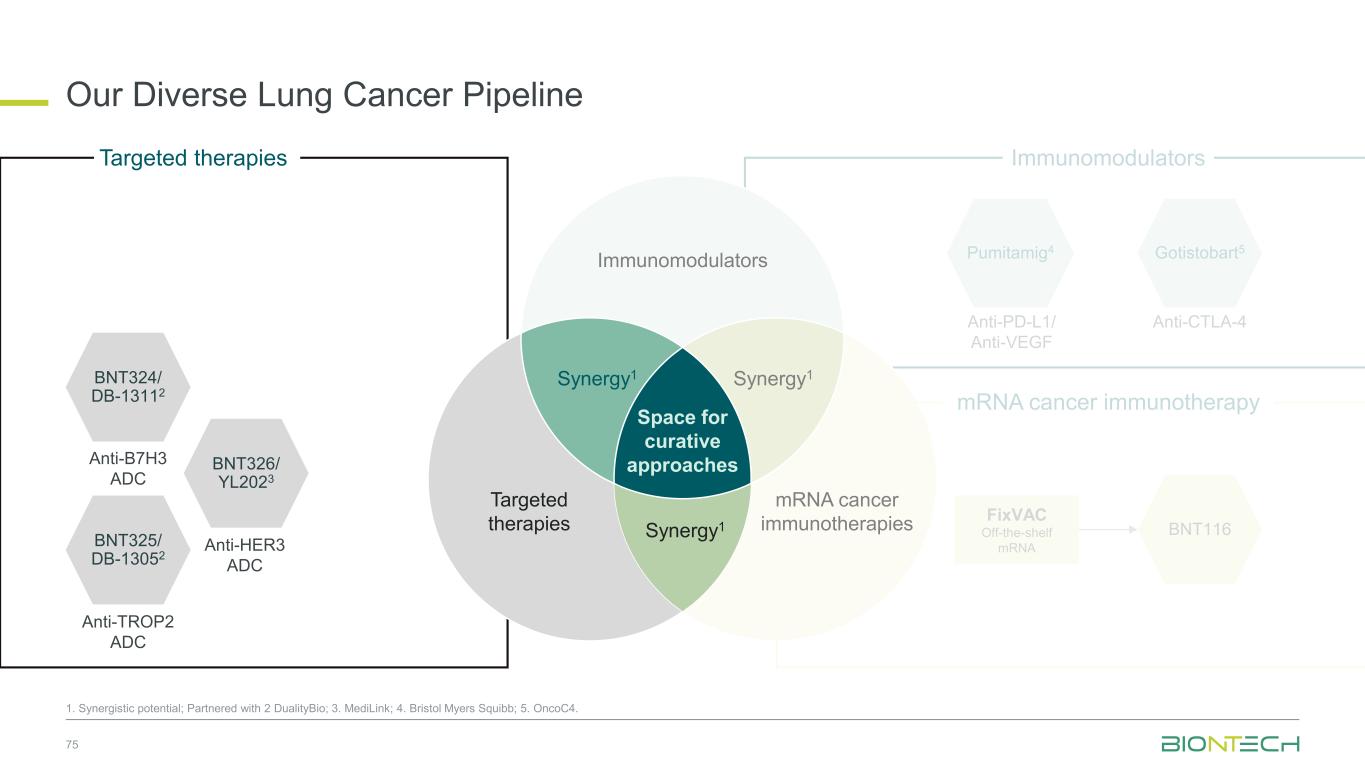 Neoadj / Resectable 1L metastatic 2L+ metastatic NSCLC without AGA NSCLC with EGFR mut SCLC BioNTech’s Currently Ongoing Trials* in Lung Cancer 74 Partnered with: 1. Bristol Myers Squibb; 2. OncoC4; 3. DualityBio; 4. MediLink; *As of Nov 2025; **being conducted in China ADC mono and FixVac data provided confidence to start combination PoC trials Registrational trials in metastatic Lung Cancer with next-generation IO Pumitamig1 aiming to improve over SoC in 1L NSCLC and ES-SCLC PoC trials with ADC mono and novel combinations to inform future registrational trials Next generation IO Targeted therapy mRNA immunotherapy Registrational trials Ph1/2 PoC trials Gotistobart2 PRESERVE-003 (sq) Part 1 data to be presented at NACLC on Dec 6, 2025 FiXvac + Gotistobart2/ADCs LuCa-MERIT-1 Pumitamig1 + chemo ROSETTA Lung-01 Pumitamig1 + chemo IIT** Pumitamig1 + chemo ROSETTA LUNG-02 ADC monos BNT324/DB-13113, BNT325/DB-13053, BNT326/YL2024 Pumitamig1 + FixVac LuCa-MERIT-1 Pumitamig1 + ADCs BNT324/DB-13113, BNT325/DB-13053, BNT326/YL2024 ADC mono BNT324/ DB-13113 Pumitamig1 + ADC (BNT324/DB-13113) Gotistobart2 to provide IO option for 2L NSCLC Sq (high unmet need) Multiple Pumitamig + ADC PoC trials ongoing for data- driven decision making and inform future registrational trials in the 1L setting