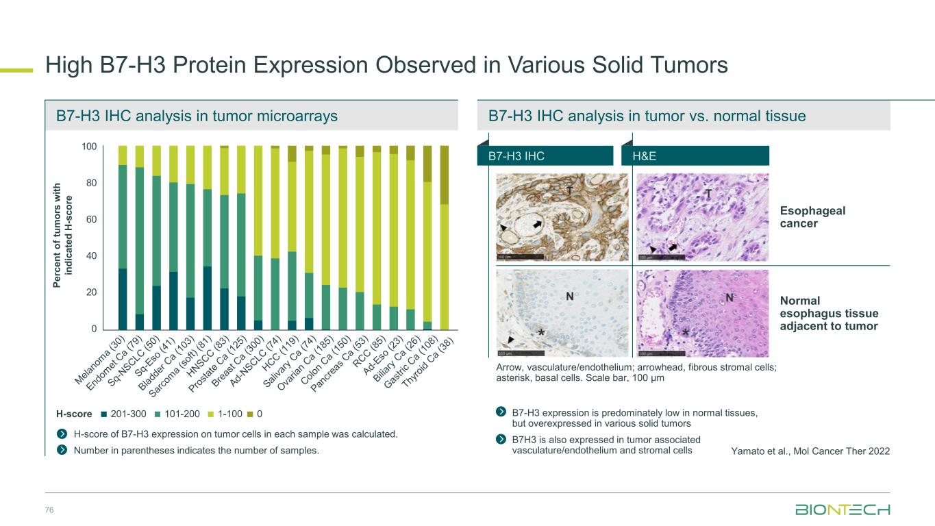 B7-H3 IHC analysis in tumor vs. normal tissueB7-H3 IHC analysis in tumor microarrays High B7-H3 Protein Expression Observed in Various Solid Tumors 76 Yamato et al., Mol Cancer Ther 2022 H-score of B7-H3 expression on tumor cells in each sample was calculated. Number in parentheses indicates the number of samples. Esophageal cancer Normal esophagus tissue adjacent to tumor B7-H3 expression is predominately low in normal tissues, but overexpressed in various solid tumors B7H3 is also expressed in tumor associated vasculature/endothelium and stromal cells Arrow, vasculature/endothelium; arrowhead, fibrous stromal cells; asterisk, basal cells. Scale bar, 100 μm P e rc e n t o f tu m o rs w it h in d ic a te d H -s c o re 1-100101-200201-300 0H-score 100 80 60 40 20 0 B7-H3 IHC H&E