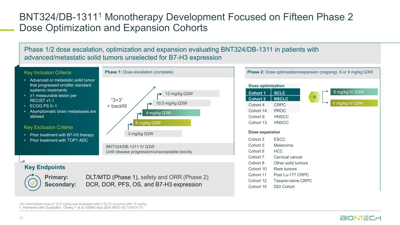 BNT324/DB-13111 Monotherapy Development Focused on Fifteen Phase 2 Dose Optimization and Expansion Cohorts .An intermediate dose of 10.5 mg/kg was evaluated after 2 DLTs occurred with 12 mg/kg. 1. Partnered with DualityBio; Cheng Y et al. ESMO Asia 2024 #57O NCT05914116 BNT324/DB-1311 IV Q3W Until disease progression/unacceptable toxicity 12 mg/kg Q3W 9 mg/kg Q3W 6 mg/kg Q3W 10.5 mg/kg Q3W 3 mg/kg Q3W “3+3” + backfill 6 mg/kg IV Q3W 9 mg/kg IV Q3W Key Inclusion Criteria • Advanced or metastatic solid tumor that progressed on/after standard systemic treatments • ≥1 measurable lesion per RECIST v1.1 • ECOG PS 0–1 • Asymptomatic brain metastases are allowed Key Exclusion Criteria • Prior treatment with B7-H3 therapy • Prior treatment with TOP1 ADC Phase 1/2 dose escalation, optimization and expansion evaluating BNT324/DB-1311 in patients with advanced/metastatic solid tumors unselected for B7-H3 expression R Dose optimization Cohort 1 SCLC Cohort 2 NSCLC Cohort 4 CRPC Cohort 14 PROC Cohort 9 HNSCC Cohort 13 HNSCC Phase 1: Dose escalation (complete) Phase 2: Dose optimization/expansion (ongoing). 6 or 9 mg/kg Q3W Dose expansion Cohort 3 ESCC Cohort 5 Melanoma Cohort 6 HCC Cohort 7 Cervical cancer Cohort 8 Other solid tumors Cohort 10 Rare tumors Cohort 11 Post Lu-177 CRPC Cohort 12 Taxane-naïve CRPC Cohort 15 DDI Cohort Key Endpoints Primary: DLT/MTD (Phase 1), safety and ORR (Phase 2) Secondary: DCR, DOR, PFS, OS, and B7-H3 expression 77