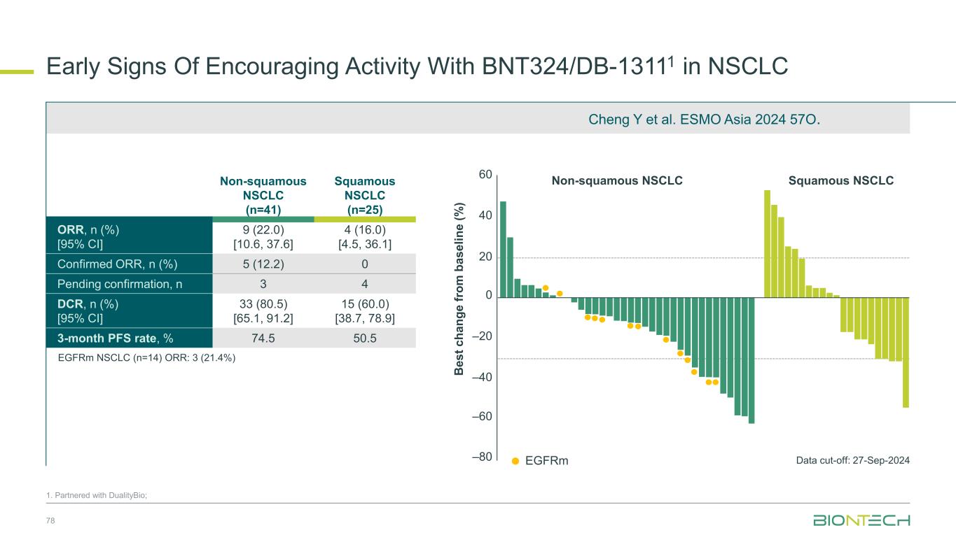 Early Signs Of Encouraging Activity With BNT324/DB-13111 in NSCLC 1. Partnered with DualityBio; EGFRm EGFRm NSCLC (n=14) ORR: 3 (21.4%) 60 40 –20 0 –40 –60 –80 20 Data cut-off: 27-Sep-2024 Non-squamous NSCLC Squamous NSCLC 78 Non-squamous NSCLC (n=41) Squamous NSCLC (n=25) ORR, n (%) [95% CI] 9 (22.0) [10.6, 37.6] 4 (16.0) [4.5, 36.1] Confirmed ORR, n (%) 5 (12.2) 0 Pending confirmation, n 3 4 DCR, n (%) [95% CI] 33 (80.5) [65.1, 91.2] 15 (60.0) [38.7, 78.9] 3-month PFS rate, % 74.5 50.5 B e s t c h a n g e f ro m b a s e li n e ( % ) Cheng Y et al. ESMO Asia 2024 57O.