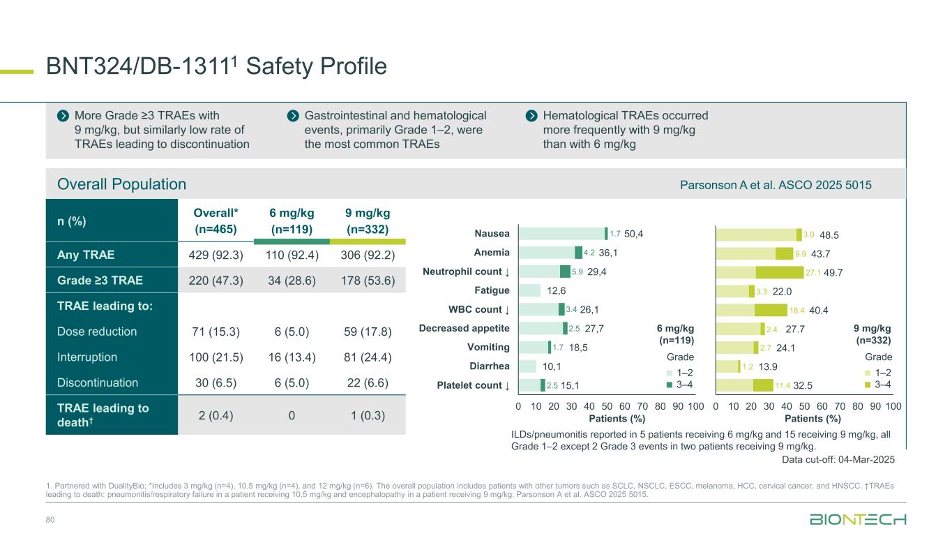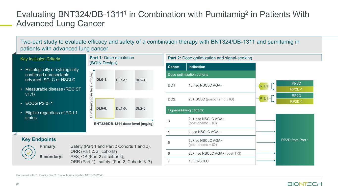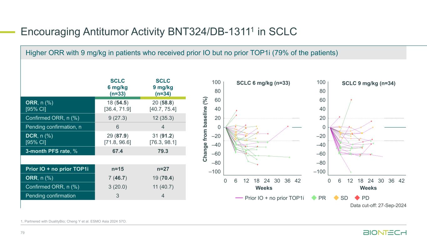 SCLC 6 mg/kg (n=33) SCLC 9 mg/kg (n=34) ORR, n (%) [95% CI] 18 (54.5) [36.4, 71.9] 20 (58.8) [40.7, 75.4] Confirmed ORR, n (%) 9 (27.3) 12 (35.3) Pending confirmation, n 6 4 DCR, n (%) [95% CI] 29 (87.9) [71.8, 96.6] 31 (91.2) [76.3, 98.1] 3-month PFS rate, % 67.4 79.3 Prior IO + no prior TOP1i n=15 n=27 ORR, n (%) 7 (46.7) 19 (70.4) Confirmed ORR, n (%) 3 (20.0) 11 (40.7) Pending confirmation 3 4 Encouraging Antitumor Activity BNT324/DB-13111 in SCLC 1, Partnered with DualityBio; Cheng Y et al. ESMO Asia 2024 57O. SCLC 6 mg/kg (n=33) SCLC 9 mg/kg (n=34) C h a n g e f ro m b a s e li n e ( % ) 100 80 60 40 20 0 –20 –40 –60 –80 –100 Weeks Weeks 0 6 12 18 24 30 36 420 6 12 18 24 30 36 42 100 80 60 40 20 0 –20 –40 –60 –80 –100 PR SD PDPrior IO + no prior TOP1i Data cut-off: 27-Sep-2024 79 Higher ORR with 9 mg/kg in patients who received prior IO but no prior TOP1i (79% of the patients) Program Name: P:\01_OngoingProjects\C_244_ONC_DB_1311_O_1001_SA\24EOP2OCT\Programs\TFL\Original\f_14_2_2_1.sas, Creation Date and Time: 19NOV2024 16:26 SCLC = small cell lung cancer. Weeks = (Date of tumor scan - first dose date + 1)/7. Footnote: Efficacy Analysis Set Figure 14.2.2.1.p12.eas.s1 Spider Plot for Percentage Change from Baseline on Sum of Target Lesion Diameter for SCLC (Dose Escalation + Expansion Part) 9 mg/kg Q3W, N=34 0 3 6 9 12 15 18 21 24 27 30 33 36 39 42 45 Weeks -100 -80 -60 -40 -20 0 20 40 60 80 100 P e r c e n t a g e C h a n g e f r o m B a s e l i n e ( % ) PDSDPRResponse: prior IO and no prior TOP1i 6 mg/kg Q3W, N=33 0 3 6 9 12 15 18 21 24 27 30 33 36 39 42 45 Weeks -100 -80 -60 -40 -20 0 20 40 60 80 100 P e r c e n t a g e C h a n g e f r o m B a s e l i n e ( % ) prior IO and no prior TOP1i Program Name: P:\01_OngoingProjects\C_244_ON DB_1311 O_100 _SA\24EOP2OCT\Programs\TFL\Original\f_14_2_2_1.sas, Creation Date and Tim : 19NOV2024 16: 6 SCLC = small cell ung cancer. Weeks = (Date of tumor scan - first dose date + 1)/7. Footnote: Efficacy Analysis Set Figure 14.2.2.1.p1 eas s Spider Plot for Percentag Change from Baseline on Sum of Target Lesion Diameter for SCLC (Dose Escalation + Expansion Part) 9 mg/kg Q3W, N=34 0 3 6 9 12 15 18 2 24 27 30 33 36 39 42 45 Weeks -100 -80 -60 -40 -20 0 20 40 60 80 100 P e r c e n t a g e C h a n g e f r o m B a s e l i n e ( % ) PDSDPRResponse: prior IO and no p ior TOP1i 6 mg/kg Q3W, N=33 0 3 6 9 12 15 18 21 24 27 30 33 36 39 42 45 Weeks -100 -80 -60 -40 -20 0 20 40 60 80 100 P e r c e n t a g e C h a n g e f r o m B a s e l i n e ( % ) prior IO and no prior TOP1i
