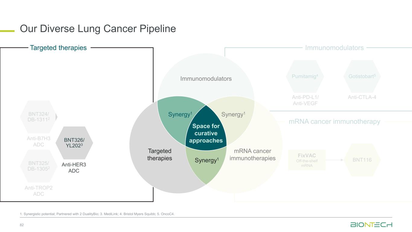 Two-part study to evaluate efficacy and safety of a combination therapy with BNT324/DB-1311 and pumitamig in patients with advanced lung cancer 81 Partnered with: 1. Duality Bio; 2. Bristol Myers Squibb; NCT06892548 Evaluating BNT324/DB-13111 in Combination with Pumitamig2 in Patients With Advanced Lung Cancer Key Endpoints Key Inclusion Criteria • Histologically or cytologically confirmed unresectable adv./met. SCLC or NSCLC • Measurable disease (RECIST v1.1) • ECOG PS 0–1 • Eligible regardless of PD-L1 status Part 2: Dose optimization and signal-seeking Primary: Safety (Part 1 and Part 2 Cohorts 1 and 2), ORR (Part 2, all cohorts) Secondary: PFS, OS (Part 2 all cohorts), ORR (Part 1), safety (Part 2, Cohorts 3–7) RP2D from Part 1 Part 1: Dose escalation (BOIN Design) DL0-0: DL1-0: DL1-1: DL2-0: DL0-1: DL2-1: BNT324/DB-1311 dose level (mg/kg) P u m it a m ig d o s e l e v e l (m g /k g ) Cohort Indication Dose optimization cohorts DO1 1L nsq NSCLC AGA− DO2 2L+ SCLC (post-chemo ± IO) Signal-seeking cohorts 3 2L+ nsq NSCLC AGA− (post-chemo ± IO) 4 1L sq NSCLC AGA− 5 2L+ sq NSCLC AGA− (post-chemo ± IO) 6 2L+ nsq NSCLC AGA+ (post-TKI) 7 1L ES-SCLC RP2D-1 RP2D R 1:1 RP2D-1 RP2D R 1:1