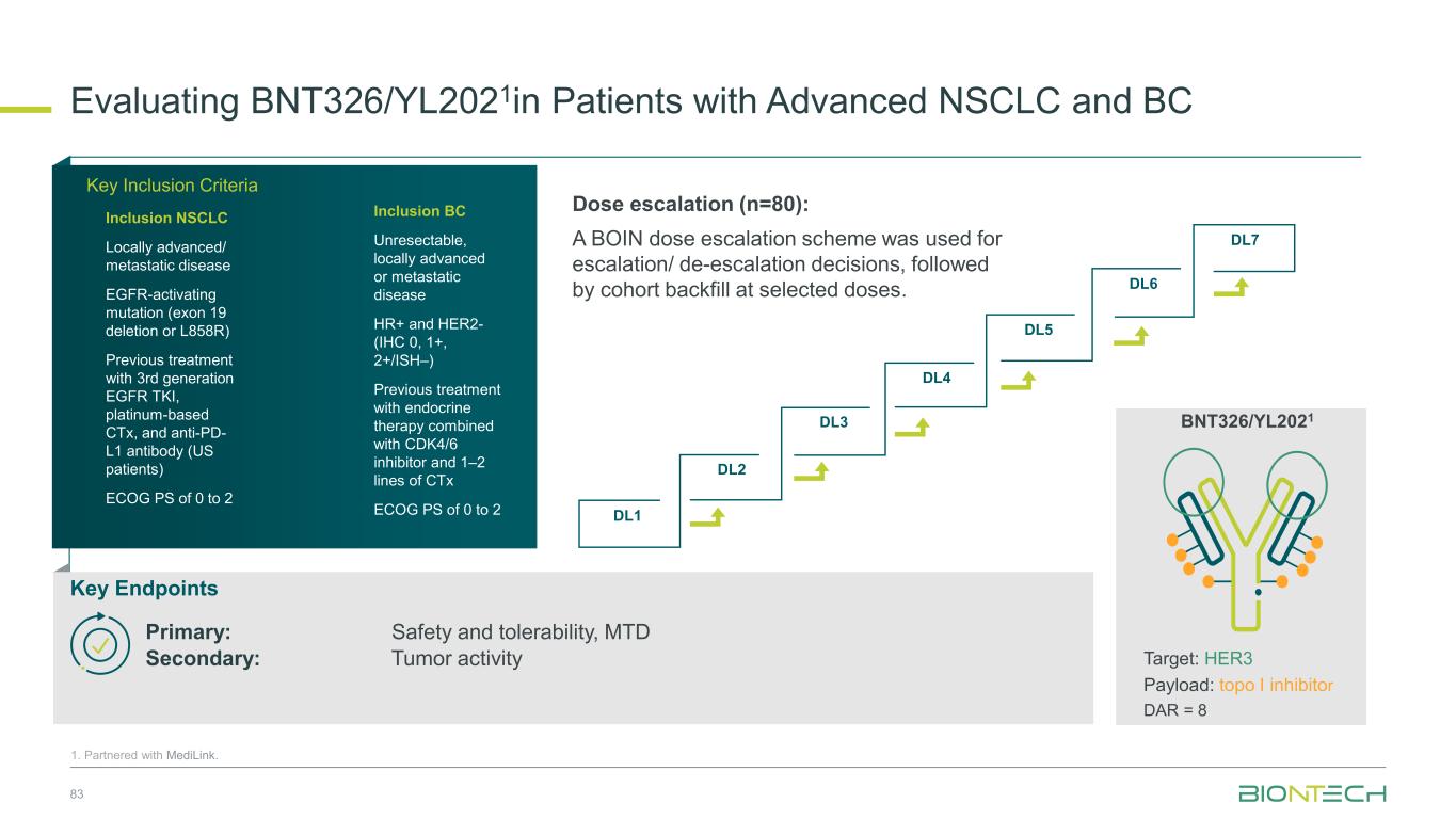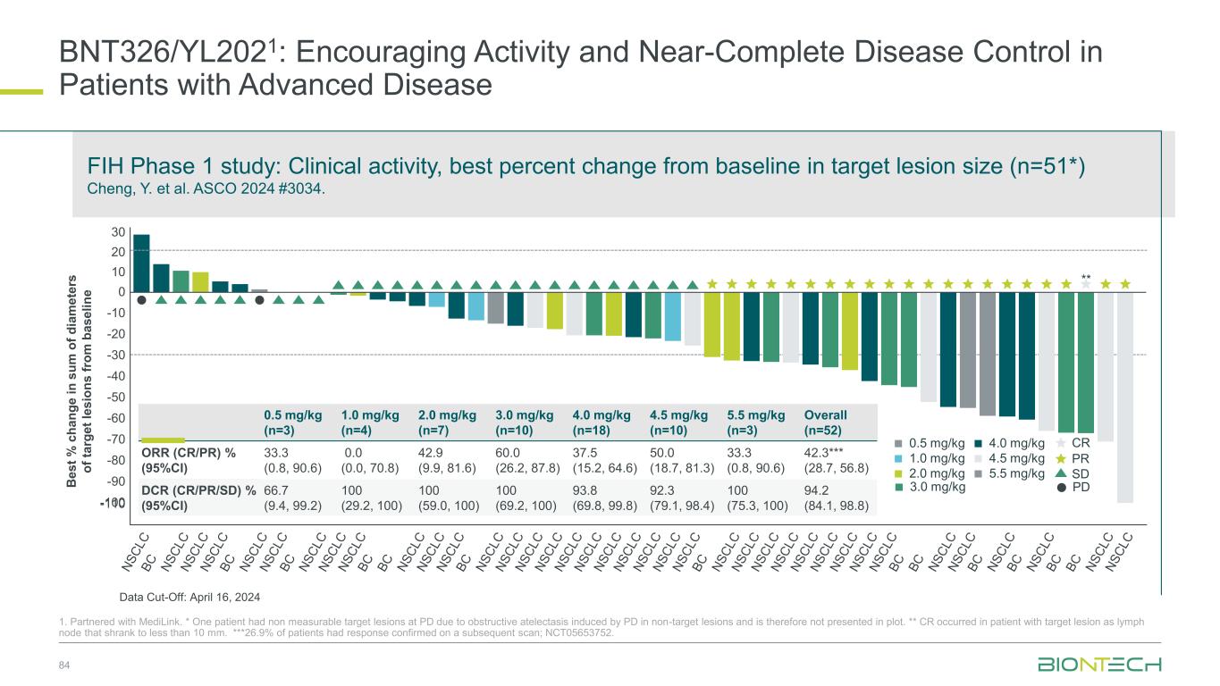 DL1 DL2 DL3 DL4 DL5 DL6 DL7 Dose escalation (n=80): A BOIN dose escalation scheme was used for escalation/ de-escalation decisions, followed by cohort backfill at selected doses. Evaluating BNT326/YL2021in Patients with Advanced NSCLC and BC 83 1. Partnered with MediLink. Key Inclusion Criteria Inclusion NSCLC Locally advanced/ metastatic disease EGFR-activating mutation (exon 19 deletion or L858R) Previous treatment with 3rd generation EGFR TKI, platinum-based CTx, and anti-PD- L1 antibody (US patients) ECOG PS of 0 to 2 Inclusion BC Unresectable, locally advanced or metastatic disease HR+ and HER2- (IHC 0, 1+, 2+/ISH–) Previous treatment with endocrine therapy combined with CDK4/6 inhibitor and 1–2 lines of CTx ECOG PS of 0 to 2 Key Endpoints Primary: Safety and tolerability, MTD Secondary: Tumor activity Target: HER3 Payload: topo I inhibitor DAR = 8 BNT326/YL2021