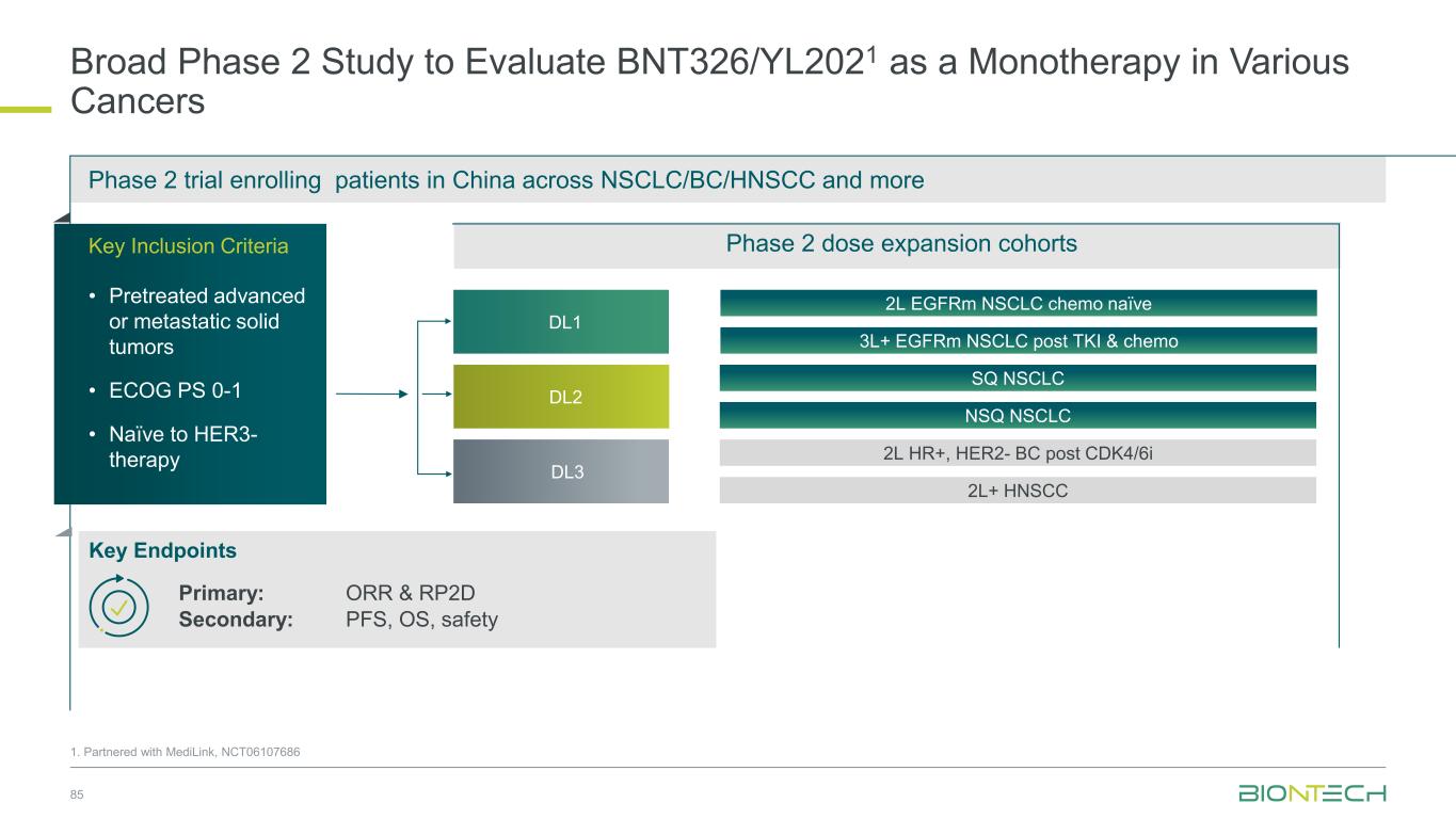 BNT326/YL2021: Encouraging Activity and Near-Complete Disease Control in Patients with Advanced Disease 84 1. Partnered with MediLink. * One patient had non measurable target lesions at PD due to obstructive atelectasis induced by PD in non-target lesions and is therefore not presented in plot. ** CR occurred in patient with target lesion as lymph node that shrank to less than 10 mm. ***26.9% of patients had response confirmed on a subsequent scan; NCT05653752. FIH Phase 1 study: Clinical activity, best percent change from baseline in target lesion size (n=51*) Cheng, Y. et al. ASCO 2024 #3034. B e s t % c h a n g e i n s u m o f d ia m e te rs o f ta rg e t le s io n s f ro m b a s e li n e 30 20 10 0 -20 -30 -40 -50 -60 -70 -90 -80 -100 0.5 mg/kg (n=3) 1.0 mg/kg (n=4) 2.0 mg/kg (n=7) 3.0 mg/kg (n=10) 4.0 mg/kg (n=18) 4.5 mg/kg (n=10) 5.5 mg/kg (n=3) Overall (n=52) ORR (CR/PR) % (95%CI) 33.3 (0.8, 90.6) 0.0 (0.0, 70.8) 42.9 (9.9, 81.6) 60.0 (26.2, 87.8) 37.5 (15.2, 64.6) 50.0 (18.7, 81.3) 33.3 (0.8, 90.6) 42.3*** (28.7, 56.8) DCR (CR/PR/SD) % (95%CI) 66.7 (9.4, 99.2) 100 (29.2, 100) 100 (59.0, 100) 100 (69.2, 100) 93.8 (69.8, 99.8) 92.3 (79.1, 98.4) 100 (75.3, 100) 94.2 (84.1, 98.8) -10 4.0 mg/kg 2.0 mg/kg 1.0 mg/kg 0.5 mg/kg 4.5 mg/kg 5.5 mg/kg SD PR CR ** 1 PD3.0 mg/kg Data Cut-Off: April 16, 2024