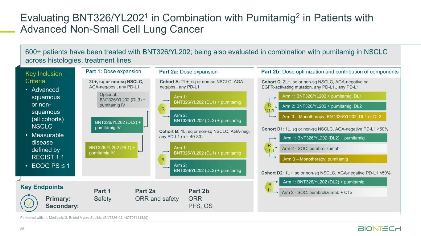 600+ patients have been treated with BNT326/YL202; being also evaluated in combination with pumitamig in NSCLC across histologies, treatment lines 86 Partnered with: 1. MediLink; 2. Bristol Myers Squibb; (BNT326-02, NCT07111520) Evaluating BNT326/YL2021 in Combination with Pumitamig2 in Patients with Advanced Non-Small Cell Lung Cancer Part 1: Dose expansion Part 2a: Dose expansion Part 2b: Dose optimization and contribution of components Optional: BNT326/YL202 (DL3) + pumitamig IV BNT326/YL202 (DL2) + pumitamig IV BNT326/YL202 (DL1) + pumitamig IV 2L+, sq or non-sq NSCLC, AGA-neg/pos., any PD-L1 Cohort B: 1L, sq or non-sq NSCLC, AGA-neg, any PD-L1 (n = 40-80) Cohort C: 2L+, sq or non-sq NSCLC, AGA-negative or EGFR-activating mutation, any PD-L1., any PD-L1 Cohort A: 2L+, sq or non-sq NSCLC, AGA- neg/pos., any PD-L1 Arm 1: BNT326/YL202 (DL1) + pumitamig, R Arm 2: BNT326/YL202 (DL2) + pumitamig Arm 2: BNT326/YL202 + pumitamig, DL2 Arm 1: BNT326/YL202 + pumitamig, DL1 Arm 3 – Monotherapy: BNT326/YL202, DL1 or DL2 R 1:1:1 Arm 2 - SOC: pembrolizumab Arm 1: BNT326/YL202 (DL2) + pumitamig Arm 3 – Monotherapy: pumitamig Cohort D1: 1L, sq or non-sq NSCLC, AGA-negative PD-L1 ≥50% Arm 2 - SOC: pembrolizumab + CTx Arm 1: BNT326/YL202 (DL2) + pumitamig R 1:1 Cohort D2: 1L+, sq or non-sq NSCLC, AGA-negative PD-L1 <50% R Arm 1: BNT326/YL202 (DL1) + pumitamig Arm 2: BNT326/YL202 (DL2) + pumitamig Key Inclusion Criteria • Advanced squamous or non- squamous (all cohorts) NSCLC • Measurable disease defined by RECIST 1.1 • ECOG PS ≤ 1 Key Endpoints Part 1 Part 2a Part 2b Primary: Secondary: Safety ORR and safety ORR PFS, OS R 1:1:1