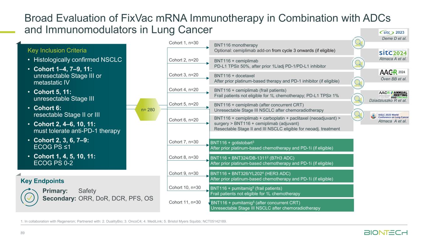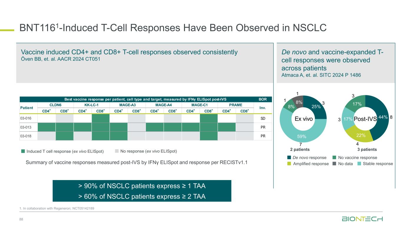 Induced T cell response (ex vivo ELISpot) De novo and vaccine-expanded T- cell responses were observed across patients Atmaca A, et. al. SITC 2024 P 1486 BNT1161-Induced T-Cell Responses Have Been Observed in NSCLC 88 Vaccine induced CD4+ and CD8+ T-cell responses observed consistently Öven BB, et. al. AACR 2024 CT051 No response (ex vivo ELISpot) BOR CD4+ CD8+ CD4+ CD8+ CD4+ CD8+ CD4+ CD8+ CD4+ CD8+ CD4+ CD8+ 03-016 SD 03-013 PR 03-018 PR Inv. Best vaccine response per patient, cell type and target, measured by IFNγ ELISpot post-IVS Patient CLDN6 KK-LC-1 MAGE-A3 MAGE-A4 MAGE-C1 PRAME De novo response Amplified response No vaccine response No data 2 patients 3 patients De novo response Stable response No vaccine response No data Ex vivo 8% 8% 25% 59% 1 1 3 7 De novo response Stable response No vaccine response Post-IVS17% 17% 44% 22% 3 3 8 4 Amplified response Stable responseSummary of vaccine responses measured post-IVS by IFNγ ELISpot and response per RECISTv1.1 1. In collaboration with Regeneron; NCT05142189 > 90% of NSCLC patients express ≥ 1 TAA > 60% of NSCLC patients express ≥ 2 TAA