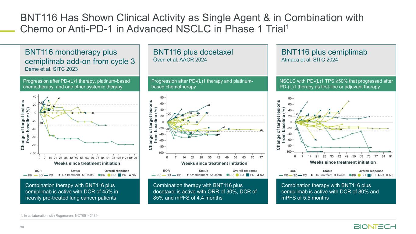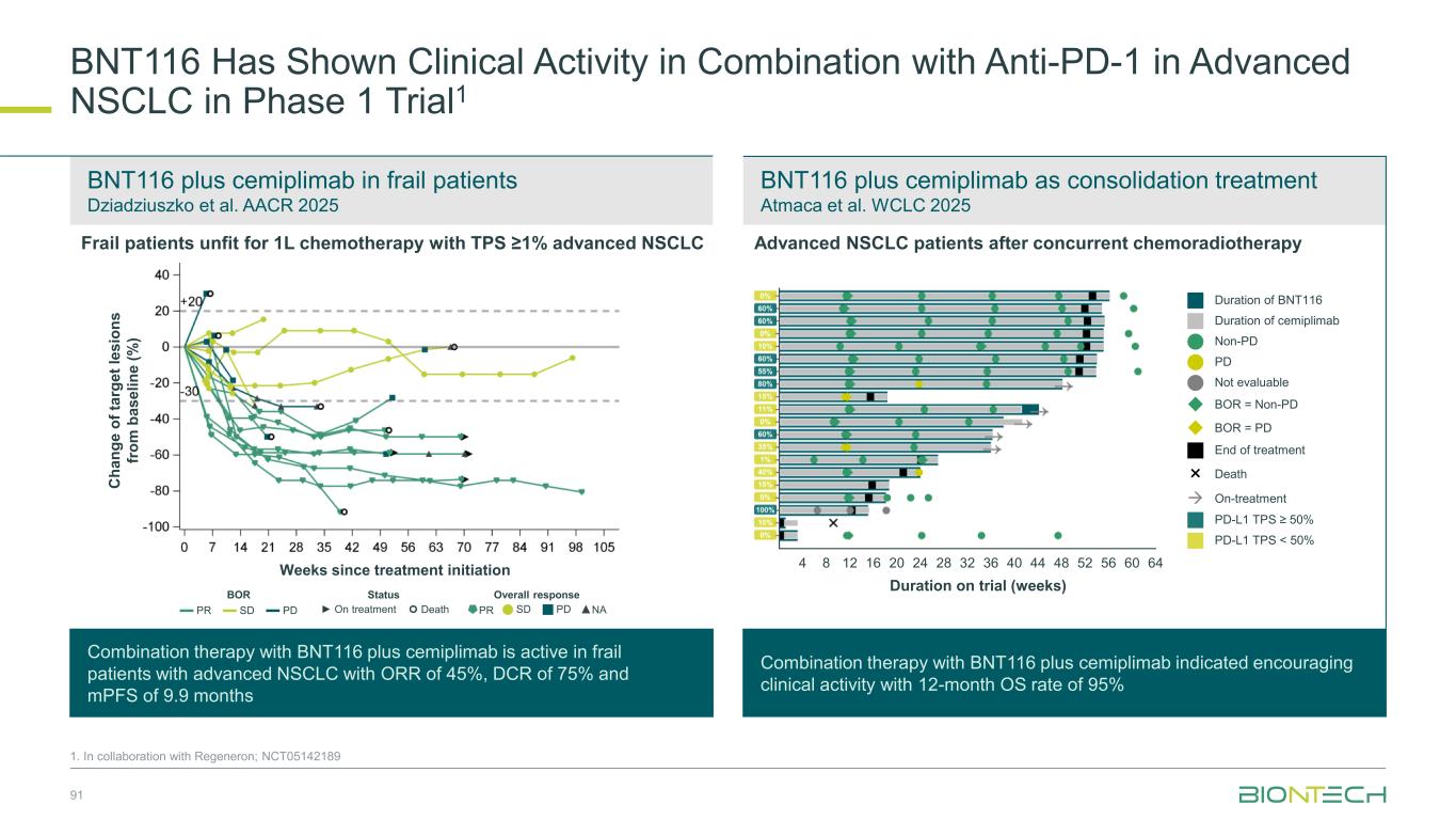 BNT116 Has Shown Clinical Activity as Single Agent & in Combination with Chemo or Anti-PD-1 in Advanced NSCLC in Phase 1 Trial1 90 1. In collaboration with Regeneron; NCT05142189. Progression after PD-(L)1 therapy, platinum-based chemotherapy, and one other systemic therapy Progression after PD-(L)1 therapy and platinum- based chemotherapy BNT116 monotherapy plus cemiplimab add-on from cycle 3 Deme et al. SITC 2023 BNT116 plus docetaxel Öven et al. AACR 2024 BNT116 plus cemiplimab Atmaca et al. SITC 2024 Combination therapy with BNT116 plus cemiplimab is active with DCR of 45% in heavily pre-treated lung cancer patients Combination therapy with BNT116 plus docetaxel is active with ORR of 30%, DCR of 85% and mPFS of 4.4 months Combination therapy with BNT116 plus cemiplimab is active with DCR of 80% and mPFS of 5.5 months NSCLC with PD-(L)1 TPS ≥50% that progressed after PD-(L)1 therapy as first-line or adjuvant therapy Weeks since treatment initiation Weeks since treatment initiation Weeks since treatment initiation C h a n g e o f ta rg e t le s io n s fr o m b a s e li n e ( % ) C h a n g e o f ta rg e t le s io n s fr o m b a s e li n e ( % ) C h a n g e o f ta rg e t le s io n s fr o m b a s e li n e ( % ) BOR Status Overall response ▬ PR ▬ SD ▬ PD ► On treatment Death PR SD PD ▲NA BOR Status Overall response ▬ PR ▬ SD ▬ PD ► On treatment Death PR SD PD ▲NA BOR Status Overall response ▬ PR▬ SD▬ PD ► On treatment Death PR SD PD ▲NA◆NE