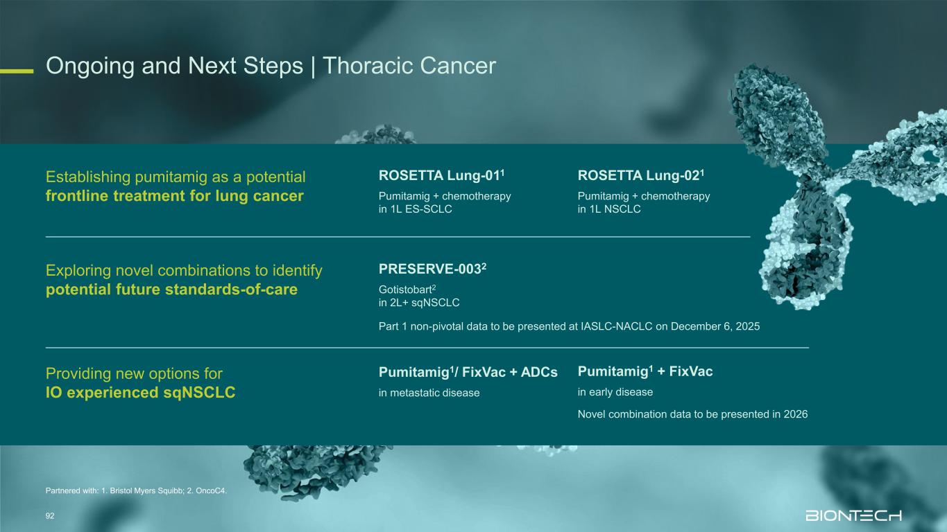 Partnered with: 1. Bristol Myers Squibb; 2. OncoC4. Ongoing and Next Steps | Thoracic Cancer Establishing pumitamig as a potential frontline treatment for lung cancer Exploring novel combinations to identify potential future standards-of-care Providing new options for IO experienced sqNSCLC ROSETTA Lung-011 Pumitamig + chemotherapy in 1L ES-SCLC ROSETTA Lung-021 Pumitamig + chemotherapy in 1L NSCLC PRESERVE-0032 Gotistobart2 in 2L+ sqNSCLC Part 1 non-pivotal data to be presented at IASLC-NACLC on December 6, 2025 Pumitamig1/ FixVac + ADCs in metastatic disease Pumitamig1 + FixVac in early disease Novel combination data to be presented in 2026 92