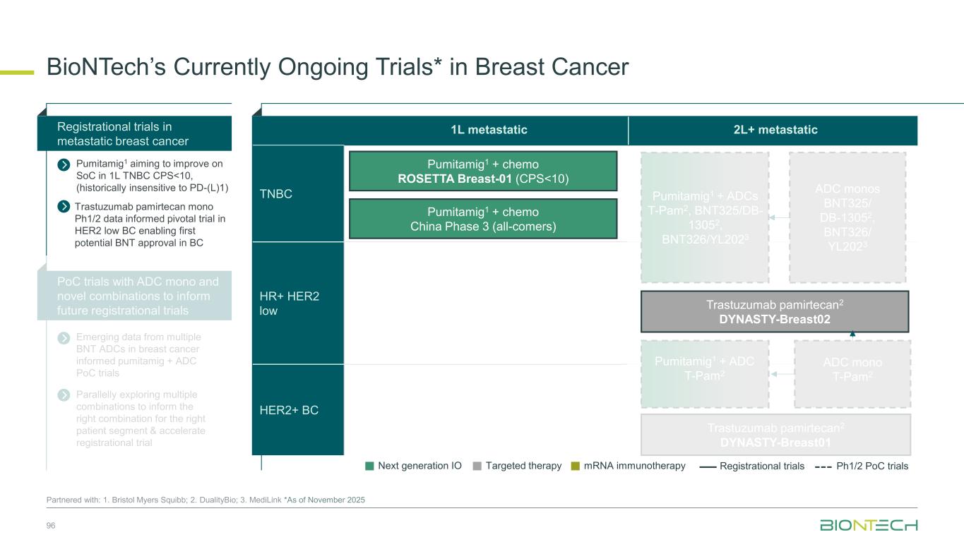 Our Diverse Breast Cancer Pipeline 95 1. Synergistic potential; Partnered with 2. DualityBio; 3. MediLink; 4. Bristol Myers Squibb. Trastuzumab pamirtecan2 Anti-HER2 ADC BNT326/ YL2023 Anti-HER3 ADC Targeted therapies BNT325/ DB-13052 Anti-TROP2 ADC mRNA cancer immunotherapies Immunomodulators Anti-PD-L1/ Anti-VEGF Pumitamig4 Immunomodulators Space for curative approaches Synergy1 Targeted therapies Synergy1Synergy1