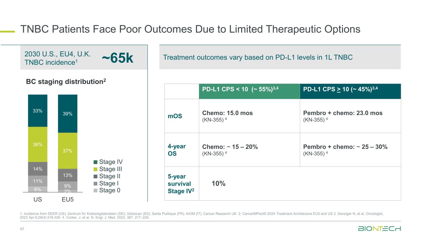 Treatment outcomes vary based on PD-L1 levels in 1L TNBC TNBC Patients Face Poor Outcomes Due to Limited Therapeutic Options 97 1. Incidence from SEER (US); Zentrum für Krebsregisterdaten (DE); Globocan (ES); Sante Publique (FR); AIOM (IT); Cancer Research UK 2. CancerMPact® 2024 Treatment Architecture EU5 and US 3. Danziger N, et al, Oncologist, 2023 Apr 6;28(4):319-326. 4. Cortes, J, et al. N. Engl. J. Med. 2022, 387, 217–226. 6% 2% 11% 9% 14% 13% 36% 37% 33% 39% US EU5 BC staging distribution2 PD-L1 CPS < 10 (~ 55%)3,4 PD-L1 CPS > 10 (~ 45%)3,4 mOS Chemo: 15.0 mos (KN-355) 4 Pembro + chemo: 23.0 mos (KN-355) 4 4-year OS Chemo: ~ 15 – 20% (KN-355) 4 Pembro + chemo: ~ 25 – 30% (KN-355) 4 5-year survival Stage IV2 ~65k2030 U.S., EU4, U.K. TNBC incidence1 10% Stage II Stage III Stage IV Stage I Stage 0