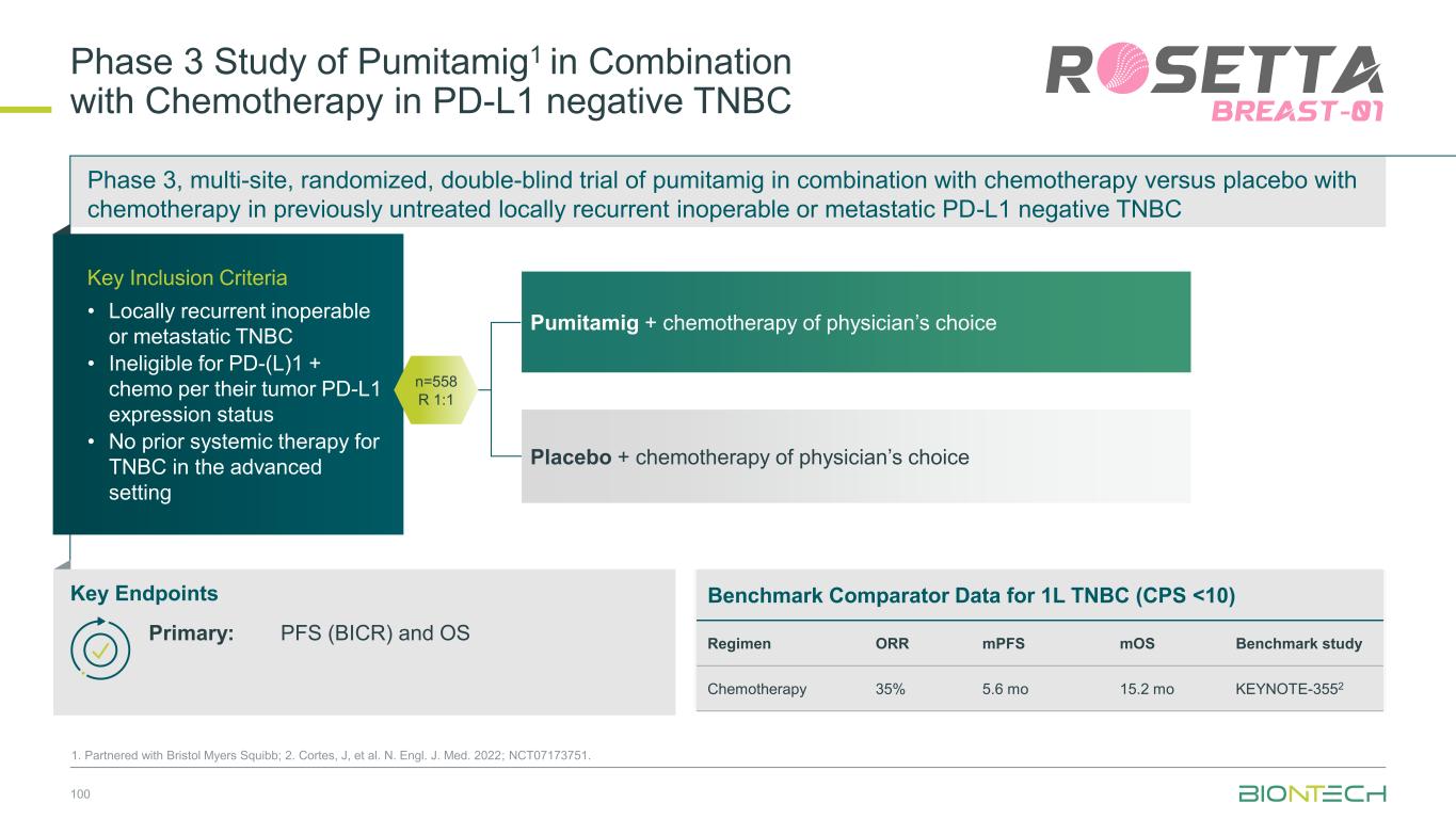 Trial enrolling heterogenous population across 1L/2L, IO naïve and experienced Arm 1 Arm 2 Pumitamig1 Global Phase 2 in Combination with Chemotherapy for 1L/2L Triple Negative Breast Cancer 99 1. Partnered with Bristol Myers Squibb 2. Cortes, J, et al. N. Engl. J. Med. 2022; BNT327-02: NCT06449222. Pumitamig dose level 1+ taxane A Pumitamig dose level 2+ taxane A 1:1 n=40 Selected dose from cohort 1 will be used in cohort 2 Arm 1 Arm 2 Investigator choice Pumitamig + taxane B Pumitamig + anti-metabolite + alkylating agent Data expected at SABCS 2025 Key Inclusion Criteria • Histologically confirmed, la/ mTNBC • 1L or 2L • If recurrent, stage I-III BC, at least 6 months has elapsed between completion of treatment with curative intent • ECOG PS 0,1 Key Endpoints Primary: ORR per RECIST v1.1 and safety according to NCI-CTCAE v5.0