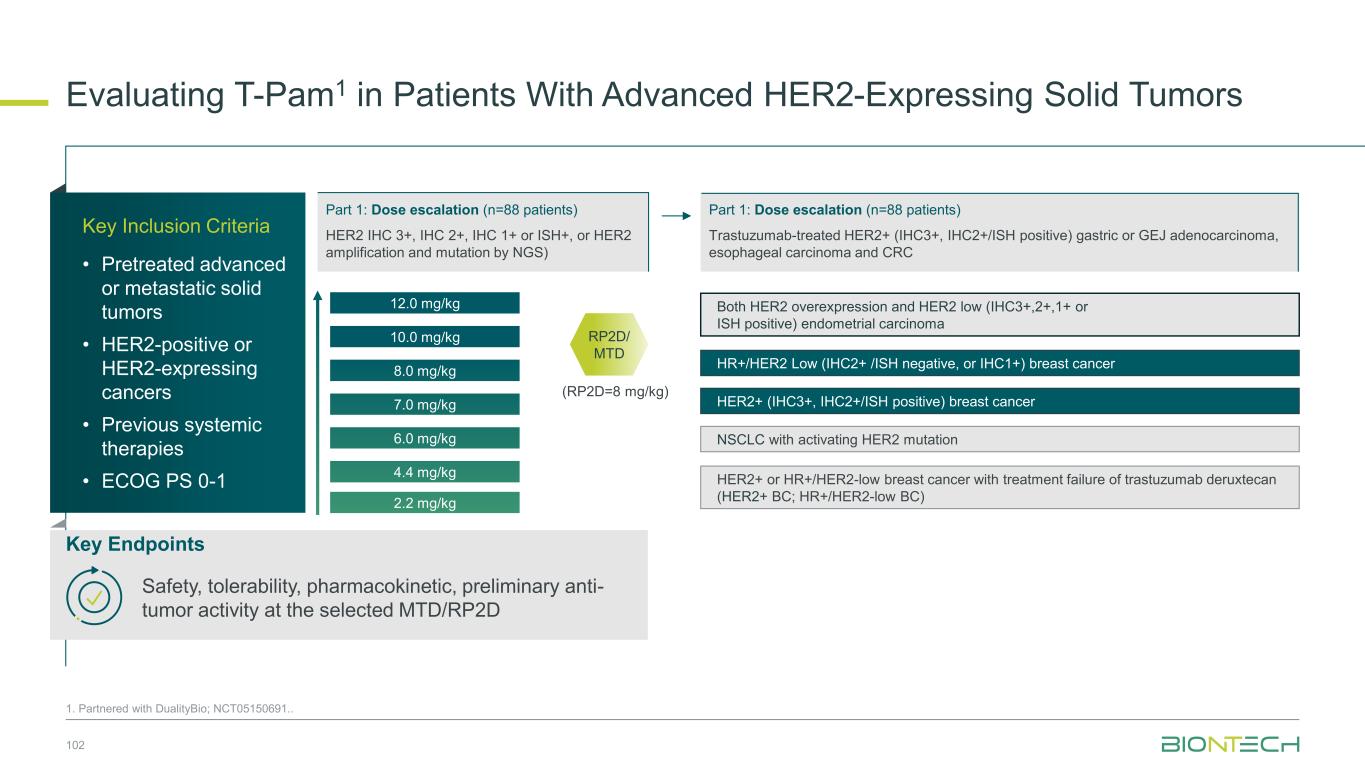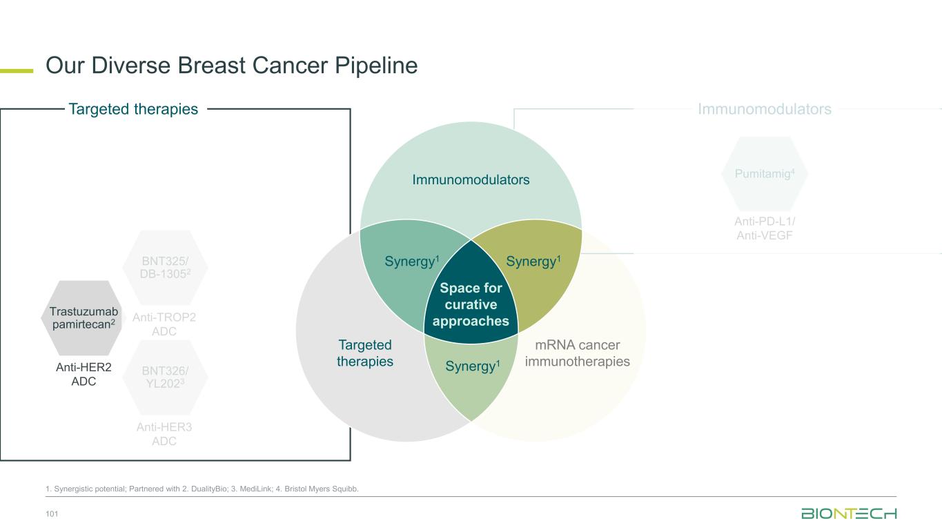 Our Diverse Breast Cancer Pipeline 101 1. Synergistic potential; Partnered with 2. DualityBio; 3. MediLink; 4. Bristol Myers Squibb. Trastuzumab pamirtecan2 Anti-HER2 ADC BNT326/ YL2023 Anti-HER3 ADC Targeted therapies BNT325/ DB-13052 Anti-TROP2 ADC mRNA cancer immunotherapies Immunomodulators Anti-PD-L1/ Anti-VEGF Pumitamig4 Immunomodulators Space for curative approaches Synergy1 Targeted therapies Synergy1Synergy1