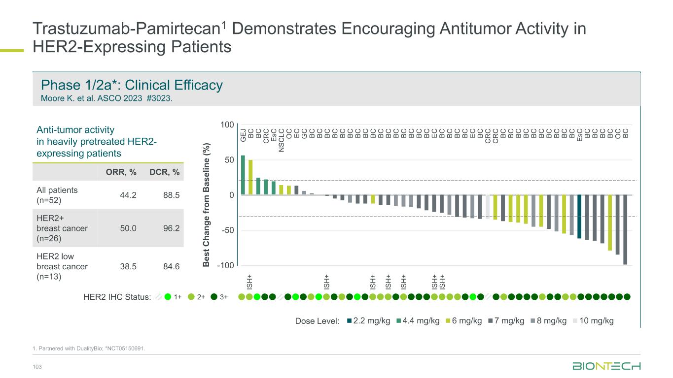 Trastuzumab-Pamirtecan1 Demonstrates Encouraging Antitumor Activity in HER2-Expressing Patients 103 1. Partnered with DualityBio; *NCT05150691. Anti-tumor activity in heavily pretreated HER2- expressing patients ORR, % DCR, % All patients (n=52) 44.2 88.5 HER2+ breast cancer (n=26) 50.0 96.2 HER2 low breast cancer (n=13) 38.5 84.6 Dose Level: 3+1+ 2+HER2 IHC Status: -100 -50 0 50 100 2.2 mg/kg 4.4 mg/kg 6 mg/kg 7 mg/kg 8 mg/kg 10 mg/kg B e s t C h a n g e f ro m B a s e li n e ( % ) IS H + IS H + IS H + IS H + IS H + IS H + IS H + G E J B C C R C E s C C R C G C B C B C B C B C B C B C E C B C B C B C E s C B C N S C L C O C B C C R C B C B C B C B C B C B C E C B C B C B C B C B C B C B C B C B C E C B C B C B C B C B C B C B C B C B C O C B C B C Phase 1/2a*: Clinical Efficacy Moore K. et al. ASCO 2023 #3023.