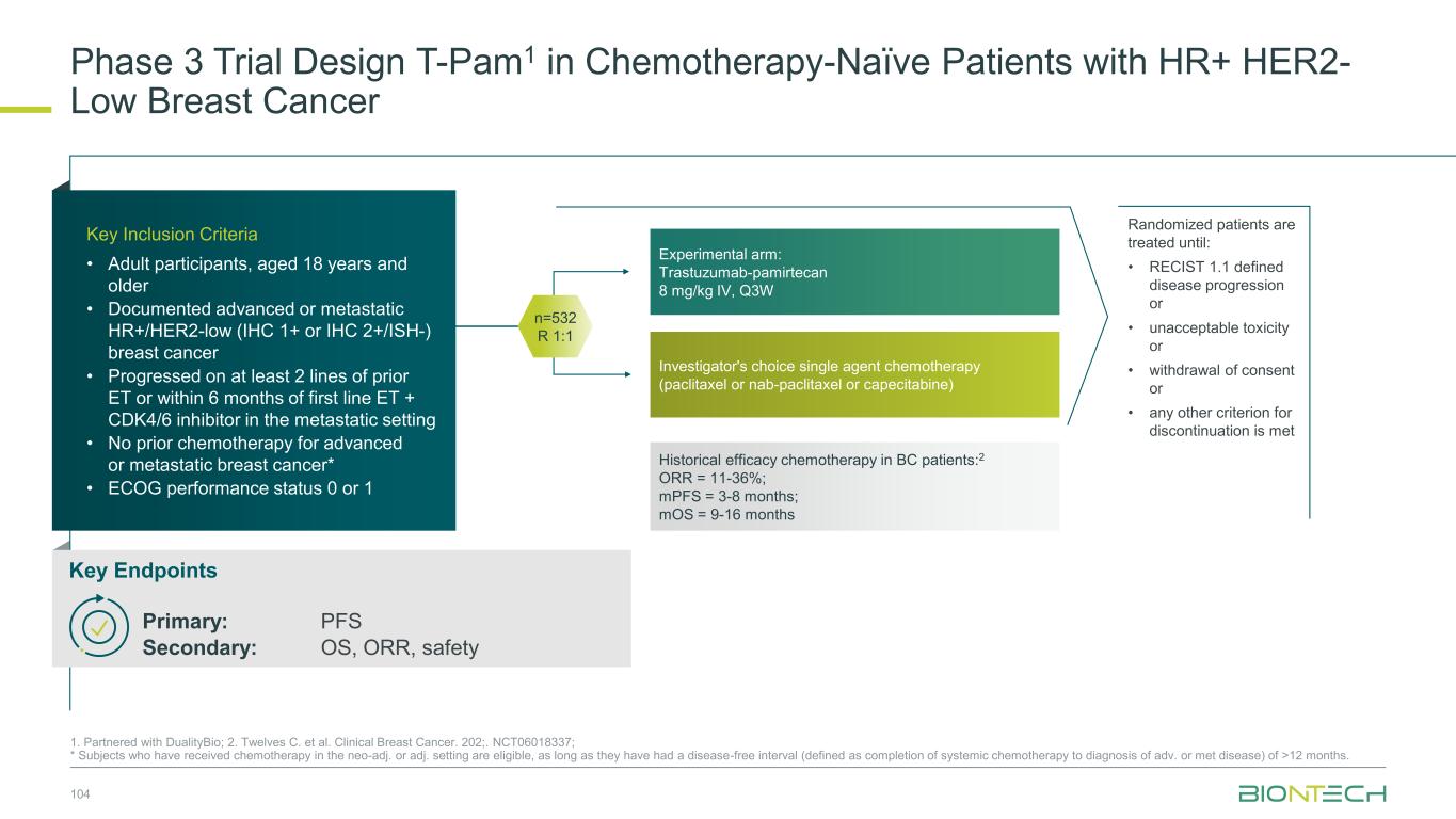 Investigator's choice single agent chemotherapy (paclitaxel or nab-paclitaxel or capecitabine) Phase 3 Trial Design T-Pam1 in Chemotherapy-Naïve Patients with HR+ HER2- Low Breast Cancer 104 1. Partnered with DualityBio; 2. Twelves C. et al. Clinical Breast Cancer. 202;. NCT06018337; * Subjects who have received chemotherapy in the neo-adj. or adj. setting are eligible, as long as they have had a disease-free interval (defined as completion of systemic chemotherapy to diagnosis of adv. or met disease) of >12 months. Randomized patients are treated until: • RECIST 1.1 defined disease progression or • unacceptable toxicity or • withdrawal of consent or • any other criterion for discontinuation is met n=532 R 1:1 Experimental arm: Trastuzumab-pamirtecan 8 mg/kg IV, Q3W Historical efficacy chemotherapy in BC patients:2 ORR = 11-36%; mPFS = 3-8 months; mOS = 9-16 months Key Inclusion Criteria • Adult participants, aged 18 years and older • Documented advanced or metastatic HR+/HER2-low (IHC 1+ or IHC 2+/ISH-) breast cancer • Progressed on at least 2 lines of prior ET or within 6 months of first line ET + CDK4/6 inhibitor in the metastatic setting • No prior chemotherapy for advanced or metastatic breast cancer* • ECOG performance status 0 or 1 Key Endpoints Primary: PFS Secondary: OS, ORR, safety