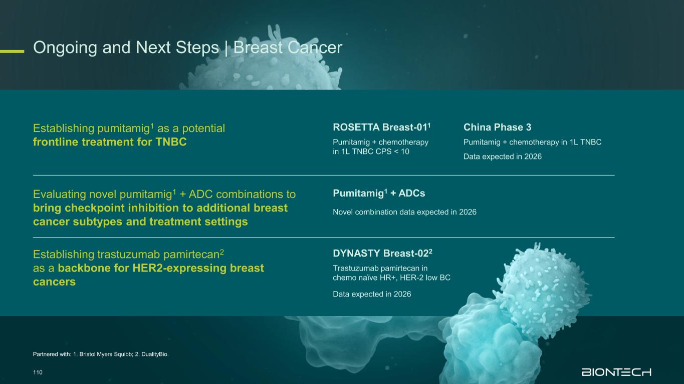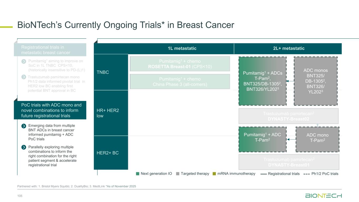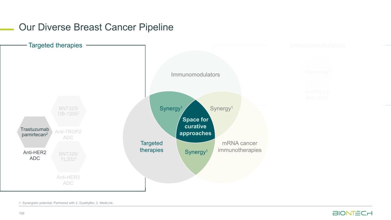 1L metastatic 2L+ metastatic TNBC HR+ HER2 low HER2+ BC BioNTech’s Currently Ongoing Trials* in Breast Cancer 105 Partnered with: 1. Bristol Myers Squibb; 2. DualityBio; 3. MediLink *As of November 2025 Pumitamig1 + chemo ROSETTA Breast-01 (CPS<10) Pumitamig1 + chemo China Phase 3 (all-comers) Emerging data from multiple BNT ADCs in breast cancer informed pumitamig + ADC PoC trials Registrational trials in metastatic breast cancer Pumitamig1 aiming to improve on SoC in 1L TNBC CPS<10, (historically insensitive to PD-(L)1) PoC trials with ADC mono and novel combinations to inform future registrational trials Next generation IO Targeted therapy mRNA immunotherapy Registrational trials Ph1/2 PoC trials Trastuzumab pamirtecan2 DYNASTY-Breast02 ADC monos BNT325/ DB-13052, BNT326/ YL2023 ADC mono T-Pam2 Pumitamig1 + ADCs T-Pam2, BNT325/DB-13052, BNT326/YL2023 Pumitamig1 + ADC T-Pam2 Trastuzumab pamirtecan mono Ph1/2 data informed pivotal trial in HER2 low BC enabling first potential BNT approval in BC Parallelly exploring multiple combinations to inform the right combination for the right patient segment & accelerate registrational trial Trastuzumab pamirtecan2 DYNASTY-Breast01