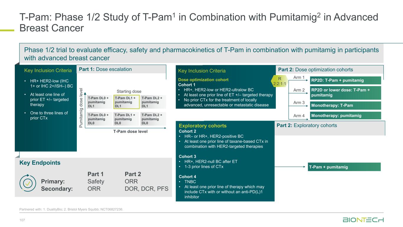 Phase 1/2 trial to evaluate efficacy, safety and pharmacokinetics of T-Pam in combination with pumitamig in participants with advanced breast cancer 107 Partnered with: 1. DualityBio; 2. Bristol Myers Squibb; NCT06827236. T-Pam: Phase 1/2 Study of T-Pam1 in Combination with Pumitamig2 in Advanced Breast Cancer Key Endpoints Key Inclusion Criteria • HR+ HER2-low (IHC 1+ or IHC 2+/ISH–) BC • At least one line of prior ET +/– targeted therapy • One to three lines of prior CTx Part 1: Dose escalation Part 2: Dose optimization cohorts Part 1 Part 2 Primary: Safety ORR Secondary: ORR DOR, DCR, PFS RP2D: T-Pam + pumitamig RP2D or lower dose: T-Pam + pumitamig Monotherapy: T-Pam Monotherapy: pumitamig Key Inclusion Criteria Dose optimization cohort Cohort 1 • HR+, HER2-low or HER2-ultralow BC • At least one prior line of ET +/– targeted therapy • No prior CTx for the treatment of locally advanced, unresectable or metastatic disease R 2:2:1:1 Arm 1 Arm 2 Arm 3 Arm 4T-Pam DL0 + pumitamig DL0 T-Pam DL1 + pumitamig DL0 T-Pam DL1 + pumitamig DL1 T-Pam DL2 + pumitamig DL0 T-Pam DL0 + pumitamig DL1 T-Pam DL2 + pumitamig DL1 T-Pam dose level P u m it a m ig d o s e l e v e l Starting dose Part 2: Exploratory cohortsExploratory cohorts Cohort 2 • HR– or HR+, HER2-positive BC • At least one prior line of taxane-based CTx in combination with HER2-targeted therapies Cohort 3 • HR+, HER2-null BC after ET • 1-3 prior lines of CTx Cohort 4 • TNBC • At least one prior line of therapy which may include CTx with or without an anti-PD(L)1 inhibitor T-Pam + pumitamig