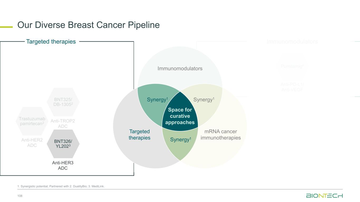 Immunomodulators Our Diverse Breast Cancer Pipeline 106 1. Synergistic potential; Partnered with 2. DualityBio; 3. MediLink. BNT326/ YL2023 Anti-HER3 ADC Targeted therapies BNT325/ DB-13052 Anti-TROP2 ADC Anti-PD-L1/ Anti-VEGF Pumitamig4 Space for curative approaches Synergy1 Targeted therapies Synergy1 Immunomodulators mRNA cancer immunotherapies Synergy1 Trastuzumab pamirtecan2 Anti-HER2 ADC