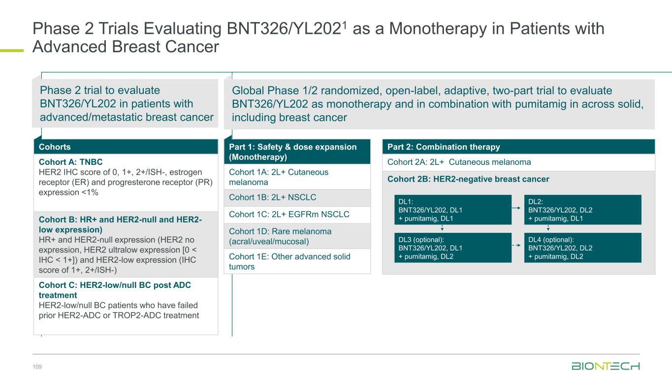 Phase 2 Trials Evaluating BNT326/YL2021 as a Monotherapy in Patients with Advanced Breast Cancer 109 Cohorts Cohort A: TNBC HER2 IHC score of 0, 1+, 2+/ISH-, estrogen receptor (ER) and progresterone receptor (PR) expression <1% Cohort B: HR+ and HER2-null and HER2- low expression) HR+ and HER2-null expression (HER2 no expression, HER2 ultralow expression [0 < IHC < 1+]) and HER2-low expression (IHC score of 1+, 2+/ISH-) Cohort C: HER2-low/null BC post ADC treatment HER2-low/null BC patients who have failed prior HER2-ADC or TROP2-ADC treatment Phase 2 trial to evaluate BNT326/YL202 in patients with advanced/metastatic breast cancer Global Phase 1/2 randomized, open-label, adaptive, two-part trial to evaluate BNT326/YL202 as monotherapy and in combination with pumitamig in across solid, including breast cancer Part 1: Safety & dose expansion (Monotherapy) Cohort 1A: 2L+ Cutaneous melanoma Cohort 1B: 2L+ NSCLC Cohort 1C: 2L+ EGFRm NSCLC Cohort 1D: Rare melanoma (acral/uveal/mucosal) Cohort 1E: Other advanced solid tumors Part 2: Combination therapy Cohort 2A: 2L+ Cutaneous melanoma Cohort 2B: HER2-negative breast cancer DL2: BNT326/YL202, DL2 + pumitamig, DL1 DL4 (optional): BNT326/YL202, DL2 + pumitamig, DL2 DL1: BNT326/YL202, DL1 + pumitamig, DL1 DL3 (optional): BNT326/YL202, DL1 + pumitamig, DL2