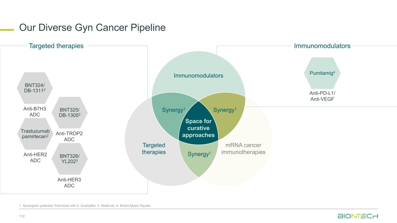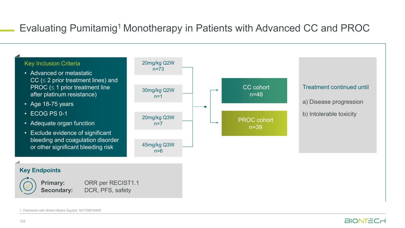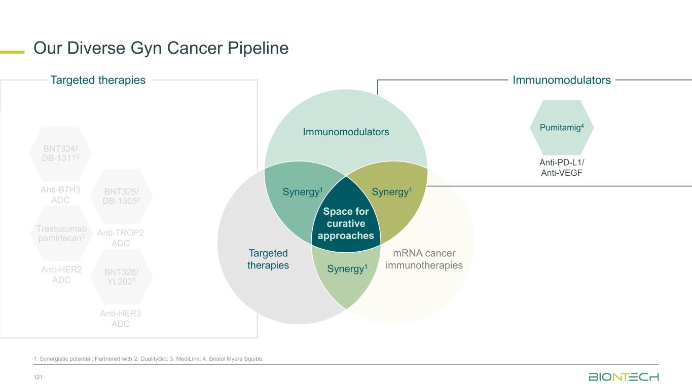 Our Diverse Gyn Cancer Pipeline 121 1. Synergistic potential; Partnered with 2. DualityBio; 3. MediLink; 4. Bristol Myers Squibb. Trastuzumab pamirtecan2 Anti-HER2 ADC BNT326/ YL2023 Anti-HER3 ADC Targeted therapies BNT325/ DB-13052 Anti-TROP2 ADC mRNA cancer immunotherapies Immunomodulators Anti-PD-L1/ Anti-VEGF Pumitamig4 Immunomodulators Space for curative approaches Synergy1 Targeted therapies Synergy1Synergy1 BNT324/ DB-13112 Anti-B7H3 ADC
