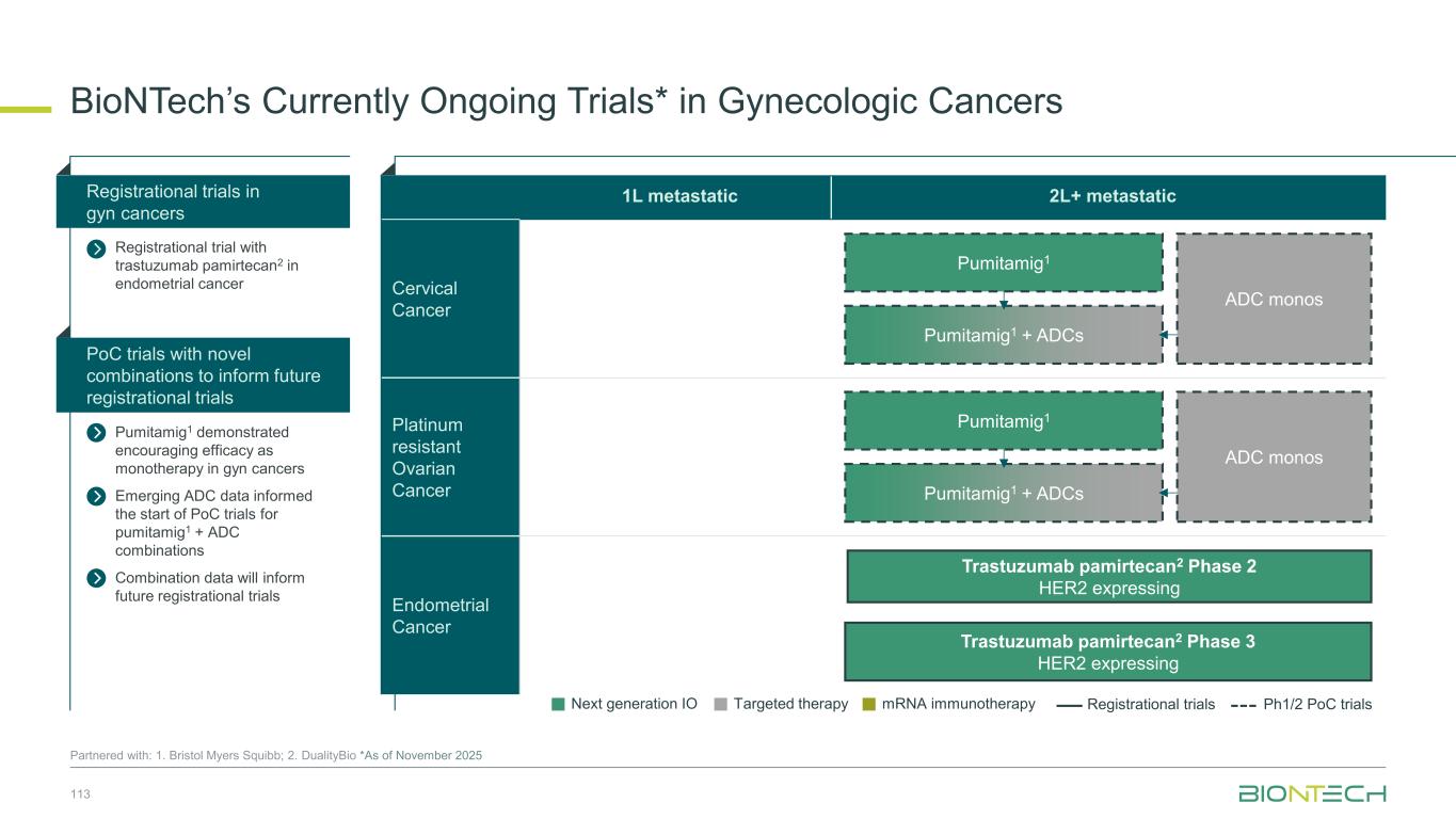Our Diverse Gyn Cancer Pipeline 112 1. Synergistic potential; Partnered with 2. DualityBio; 3. MediLink; 4. Bristol Myers Squibb. Trastuzumab pamirtecan2 Anti-HER2 ADC BNT326/ YL2023 Anti-HER3 ADC Targeted therapies BNT325/ DB-13052 Anti-TROP2 ADC mRNA cancer immunotherapies Immunomodulators Anti-PD-L1/ Anti-VEGF Pumitamig4 Immunomodulators Space for curative approaches Synergy1 Targeted therapies Synergy1Synergy1 BNT324/ DB-13112 Anti-B7H3 ADC