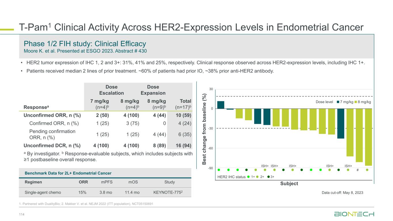 BioNTech’s Currently Ongoing Trials* in Gynecologic Cancers 113 Partnered with: 1. Bristol Myers Squibb; 2. DualityBio *As of November 2025 Pumitamig1 demonstrated encouraging efficacy as monotherapy in gyn cancers Emerging ADC data informed the start of PoC trials for pumitamig1 + ADC combinations Combination data will inform future registrational trials Registrational trial with trastuzumab pamirtecan2 in endometrial cancer PoC trials with novel combinations to inform future registrational trials Registrational trials in gyn cancers 1L metastatic 2L+ metastatic Cervical Cancer Platinum resistant Ovarian Cancer Endometrial Cancer Next generation IO Targeted therapy mRNA immunotherapy Registrational trials Ph1/2 PoC trials ADC monos Pumitamig1 Pumitamig1 + ADCs ADC monos Pumitamig1 Pumitamig1 + ADCs Trastuzumab pamirtecan2 Phase 2 HER2 expressing Trastuzumab pamirtecan2 Phase 3 HER2 expressing