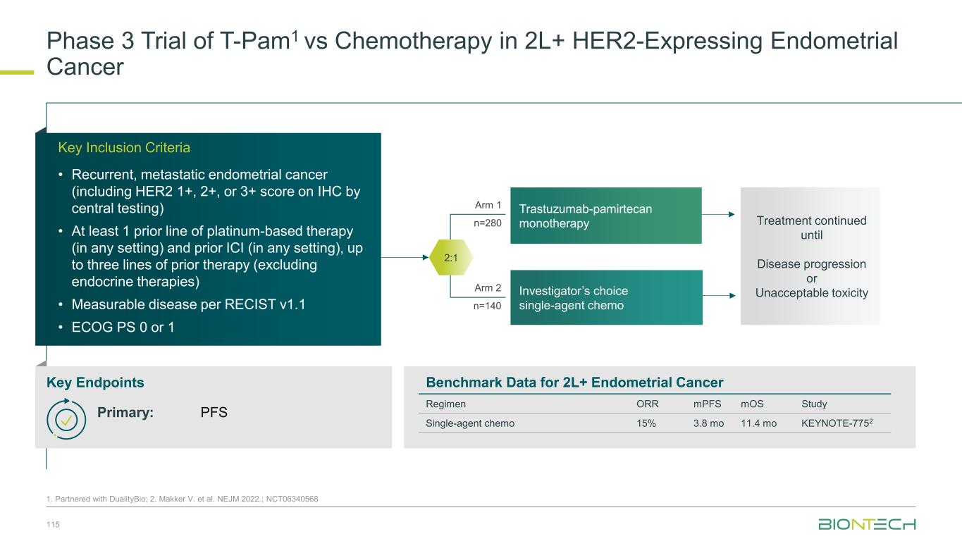 T-Pam1 Clinical Activity Across HER2-Expression Levels in Endometrial Cancer 114 1. Partnered with DualityBio; 2. Makker V. et al. NEJM 2022 (ITT population), NCT05150691 Phase 1/2 FIH study: Clinical Efficacy Moore K. et al. Presented at ESGO 2023. Abstract # 430 Responsea Dose Escalation Dose Expansion Total (n=17)b 7 mg/kg (n=4)b 8 mg/kg (n=4)b 8 mg/kg (n=9)b Unconfirmed ORR, n (%) 2 (50) 4 (100) 4 (44) 10 (59) Confirmed ORR, n (%) 1 (25) 3 (75) 0 4 (24) Pending confirmation ORR, n (%) 1 (25) 1 (25) 4 (44) 6 (35) Unconfirmed DCR, n (%) 4 (100) 4 (100) 8 (89) 16 (94) a By investigator. b Response-evaluable subjects, which includes subjects with ≥1 postbaseline overall response. B e s t c h a n g e f ro m b a s e li n e ( % ) ISH+ ISH+ ISH+ ISH+ ISH+ # Subject 30 0 -30 -60 -90 Dose level 7 mg/kg 8 mg/kg 1+ 2+ 3+HER2 IHC status • HER2 tumor expression of IHC 1, 2 and 3+: 31%, 41% and 25%, respectively. Clinical response observed across HER2-expression levels, including IHC 1+. • Patients received median 2 lines of prior treatment. ~60% of patients had prior IO, ~38% prior anti-HER2 antibody. Benchmark Data for 2L+ Endometrial Cancer Regimen ORR mPFS mOS Study Single-agent chemo 15% 3.8 mo 11.4 mo KEYNOTE-7752 Data cut-off: May 8, 2023