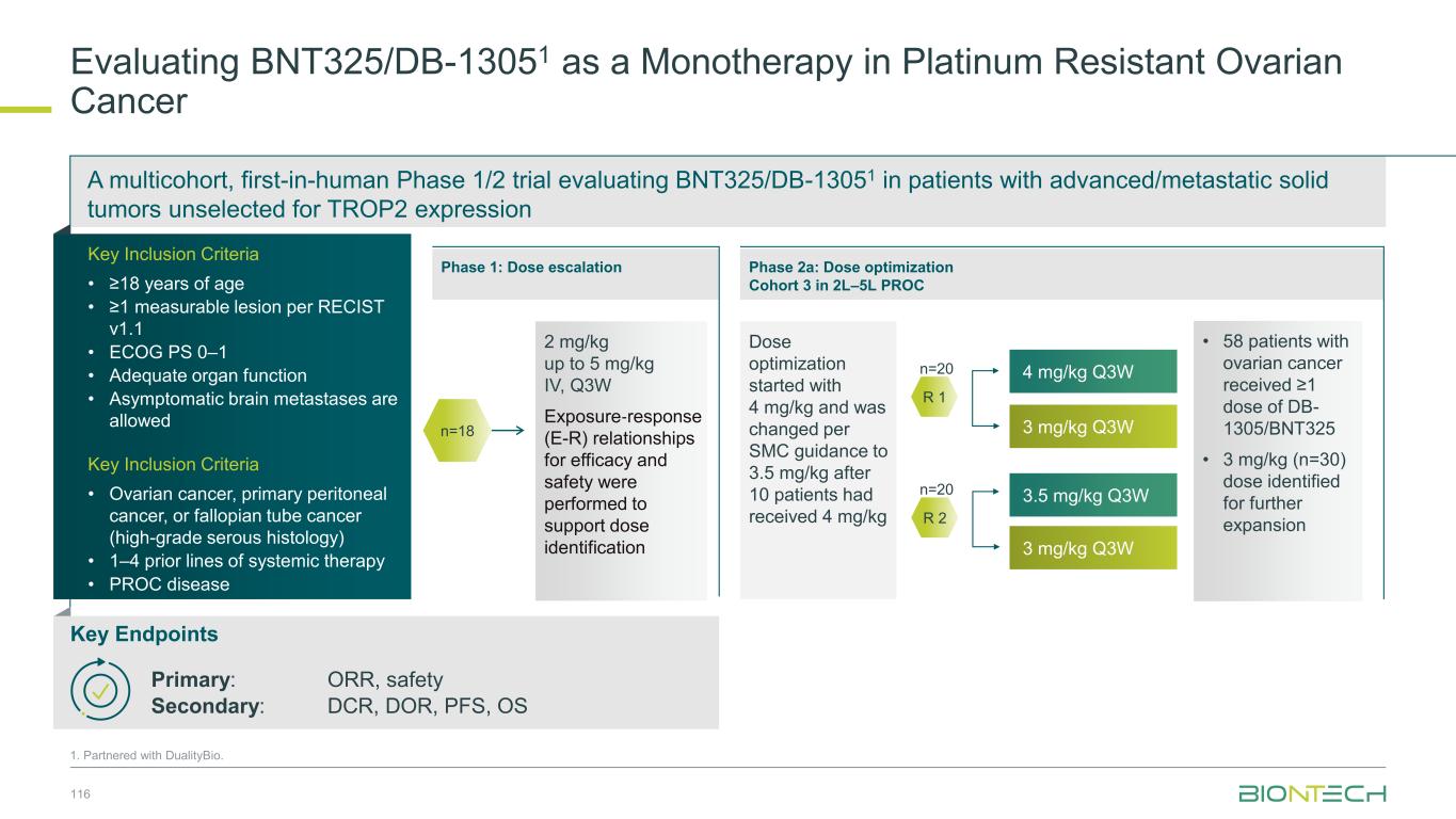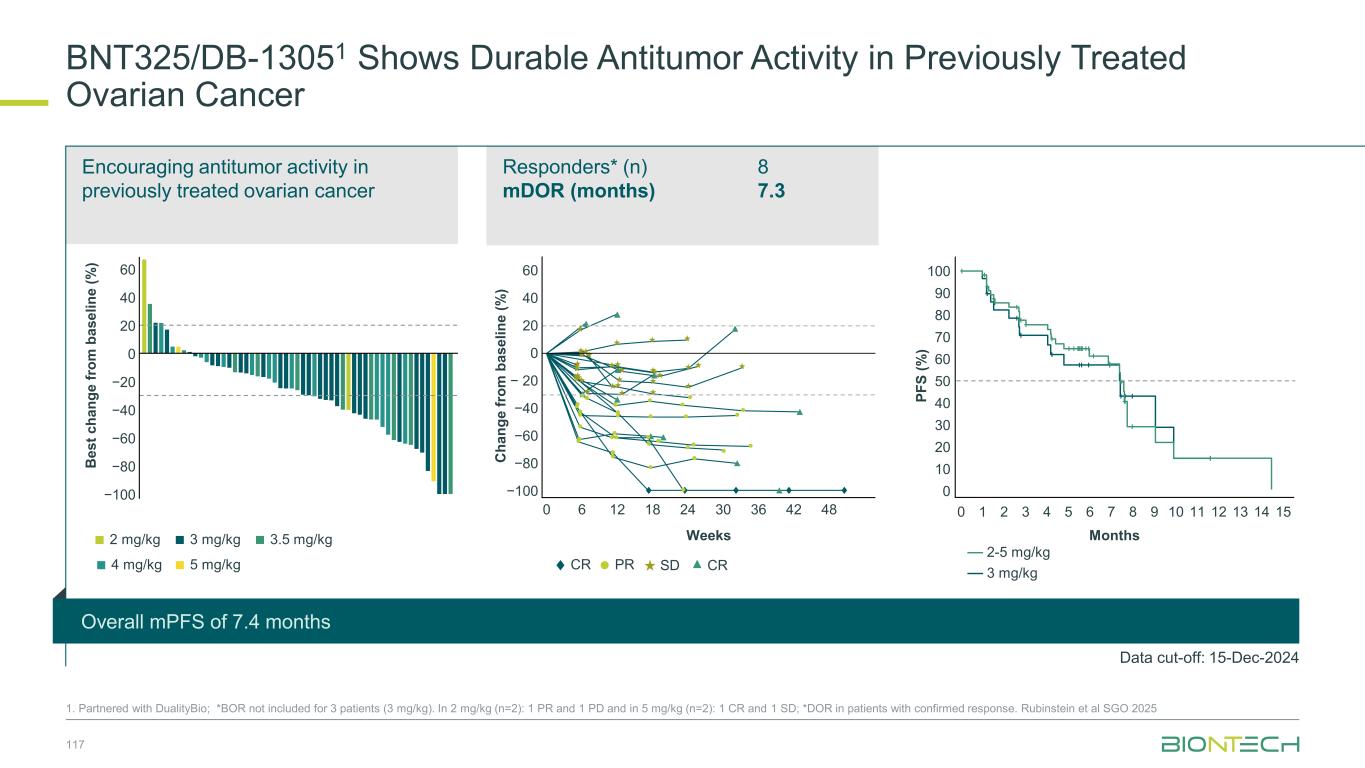 A multicohort, first-in-human Phase 1/2 trial evaluating BNT325/DB-13051 in patients with advanced/metastatic solid tumors unselected for TROP2 expression Evaluating BNT325/DB-13051 as a Monotherapy in Platinum Resistant Ovarian Cancer 116 1. Partnered with DualityBio. Key Endpoints Primary: ORR, safety Secondary: DCR, DOR, PFS, OS Key Inclusion Criteria • ≥18 years of age • ≥1 measurable lesion per RECIST v1.1 • ECOG PS 0–1 • Adequate organ function • Asymptomatic brain metastases are allowed Key Inclusion Criteria • Ovarian cancer, primary peritoneal cancer, or fallopian tube cancer (high-grade serous histology) • 1–4 prior lines of systemic therapy • PROC disease R 1 4 mg/kg Q3W 3 mg/kg Q3W n=20 R 2 n=20 3.5 mg/kg Q3W 3 mg/kg Q3W Dose optimization started with 4 mg/kg and was changed per SMC guidance to 3.5 mg/kg after 10 patients had received 4 mg/kg Phase 2a: Dose optimization Cohort 3 in 2L–5L PROC Phase 1: Dose escalation 2 mg/kg up to 5 mg/kg IV, Q3W Exposure‐response (E-R) relationships for efficacy and safety were performed to support dose identification n=18 • 58 patients with ovarian cancer received ≥1 dose of DB- 1305/BNT325 • 3 mg/kg (n=30) dose identified for further expansion