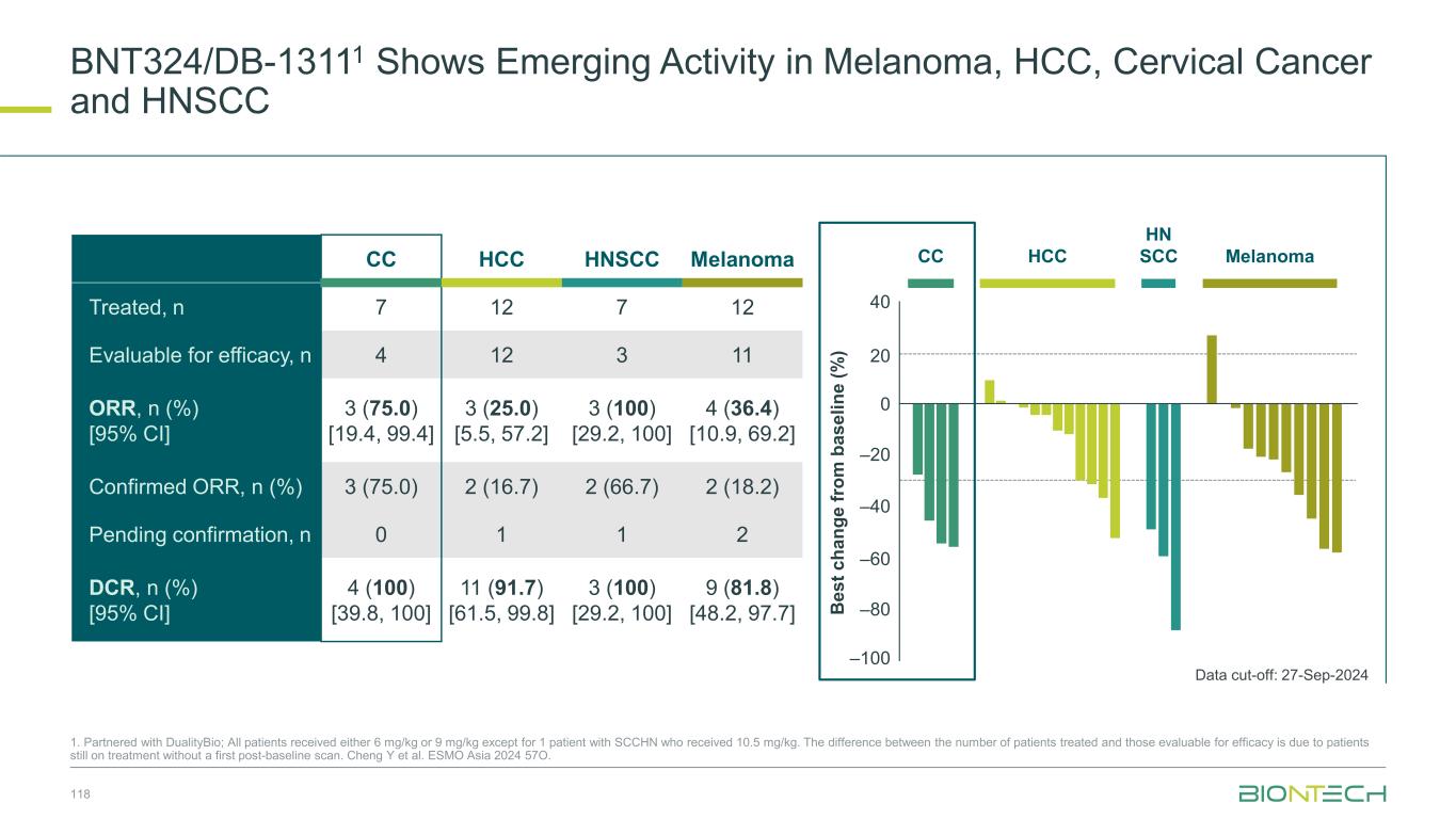 Overall mPFS of 7.4 months Responders* (n) mDOR (months) 8 7.3 Encouraging antitumor activity in previously treated ovarian cancer BNT325/DB-13051 Shows Durable Antitumor Activity in Previously Treated Ovarian Cancer 1. Partnered with DualityBio; *BOR not included for 3 patients (3 mg/kg). In 2 mg/kg (n=2): 1 PR and 1 PD and in 5 mg/kg (n=2): 1 CR and 1 SD; *DOR in patients with confirmed response. Rubinstein et al SGO 2025 117 117 −100 60 40 20 0 −20 −40 −60 −80B e s t c h a n g e f ro m b a s e li n e ( % ) 2 mg/kg 3 mg/kg 3.5 mg/kg 4 mg/kg 5 mg/kg C h a n g e f ro m b a s e li n e ( % ) −100 60 40 0 − 20 −40 −60 −80 20 0 6 12 18 24 30 36 42 48 CR PR Weeks SD CR 100 90 70 40 30 20 10 0 80 60 50 0 2 4 6 158 10 11 12 131 3 5 7 9 14 P F S ( % ) Months Data cut-off: 15-Dec-2024 3 mg/kg 2-5 mg/kg