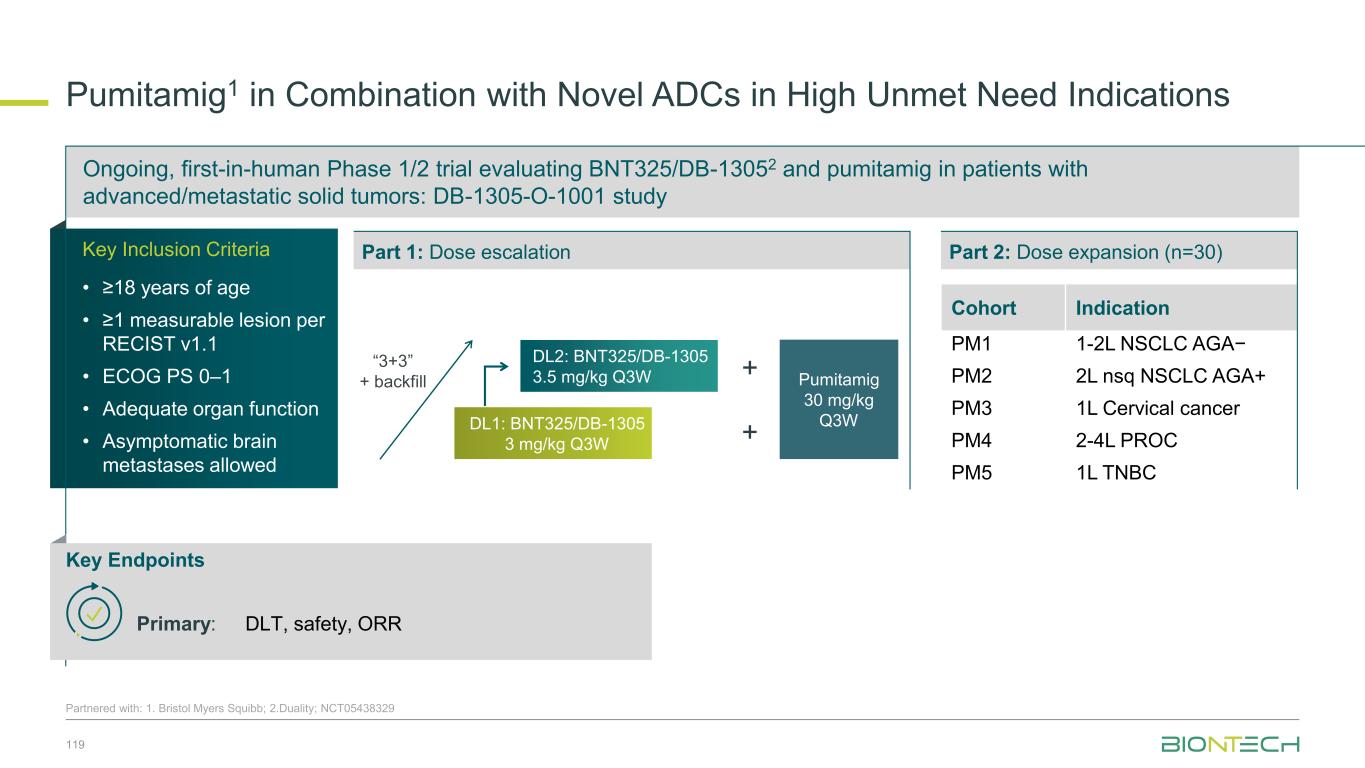 Pumitamig1 in Combination with Novel ADCs in High Unmet Need Indications Partnered with: 1. Bristol Myers Squibb; 2.Duality; NCT05438329 DL1: BNT325/DB-1305 3 mg/kg Q3W DL2: BNT325/DB-1305 3.5 mg/kg Q3W “3+3” + backfill Key Inclusion Criteria • ≥18 years of age • ≥1 measurable lesion per RECIST v1.1 • ECOG PS 0–1 • Adequate organ function • Asymptomatic brain metastases allowed Ongoing, first-in-human Phase 1/2 trial evaluating BNT325/DB-13052 and pumitamig in patients with advanced/metastatic solid tumors: DB-1305-O-1001 study Cohort Indication PM1 1-2L NSCLC AGA− PM2 2L nsq NSCLC AGA+ PM3 1L Cervical cancer PM4 2-4L PROC PM5 1L TNBC Part 1: Dose escalation Part 2: Dose expansion (n=30) Key Endpoints Primary: DLT, safety, ORR Pumitamig 30 mg/kg Q3W + + 119