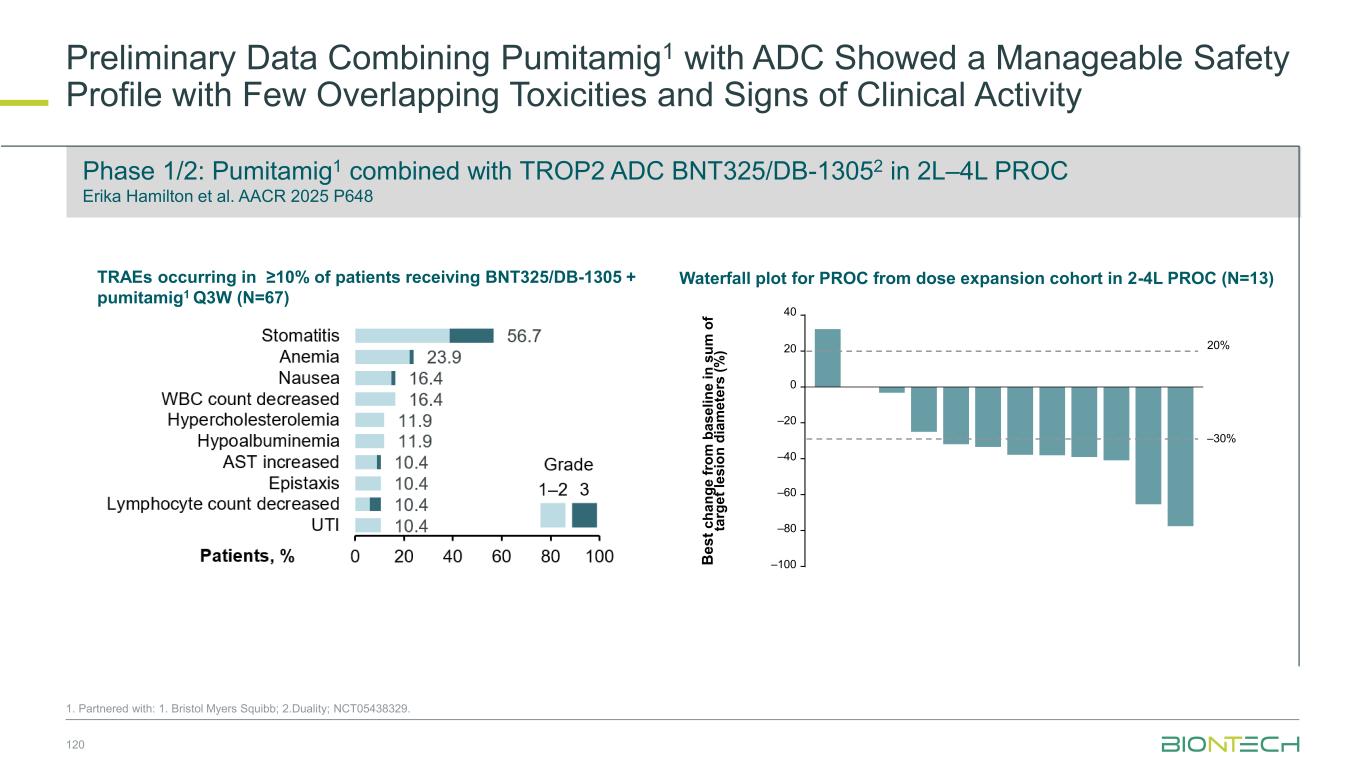 Preliminary Data Combining Pumitamig1 with ADC Showed a Manageable Safety Profile with Few Overlapping Toxicities and Signs of Clinical Activity 120 Phase 1/2: Pumitamig1 combined with TROP2 ADC BNT325/DB-13052 in 2L–4L PROC Erika Hamilton et al. AACR 2025 P648 1. Partnered with: 1. Bristol Myers Squibb; 2.Duality; NCT05438329. 20% 0 –20 –40 –60 –80 –100B e s t c h a n g e f ro m b a s e li n e i n s u m o f ta rg e t le s io n d ia m e te rs ( % ) –30% 20 40 Waterfall plot for PROC from dose expansion cohort in 2-4L PROC (N=13)TRAEs occurring in ≥10% of patients receiving BNT325/DB-1305 + pumitamig1 Q3W (N=67)