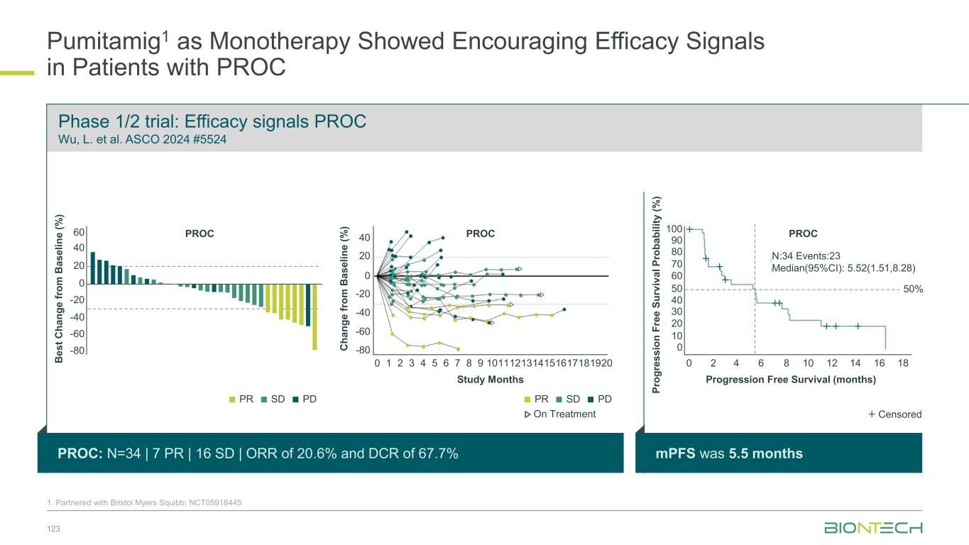 Evaluating Pumitamig1 Monotherapy in Patients with Advanced CC and PROC 1. Partnered with Bristol Myers Squibb; NCT05918445 122 Key Inclusion Criteria • Advanced or metastatic CC ( 2 prior treatment lines) and PROC ( 1 prior treatment line after platinum resistance) • Age 18-75 years • ECOG PS 0-1 • Adequate organ function • Exclude evidence of significant bleeding and coagulation disorder or other significant bleeding risk CC cohort n=48 PROC cohort n=39 Treatment continued until a) Disease progression b) Intolerable toxicity Key Endpoints Primary: ORR per RECIST1.1 Secondary: DCR, PFS, safety 20mg/kg Q2W n=73 30mg/kg Q2W n=1 20mg/kg Q3W n=7 45mg/kg Q3W n=6