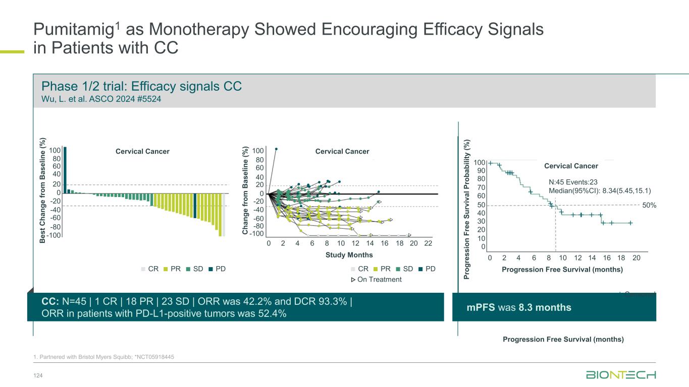 Pumitamig1 as Monotherapy Showed Encouraging Efficacy Signals in Patients with CC 124 1. Partnered with Bristol Myers Squibb; *NCT05918445 Phase 1/2 trial: Efficacy signals CC Wu, L. et al. ASCO 2024 #5524 CC: N=45 | 1 CR | 18 PR | 23 SD | ORR was 42.2% and DCR 93.3% | ORR in patients with PD-L1-positive tumors was 52.4% mPFS was 8.3 months B e s t C h a n g e fr o m B a s e li n e ( % ) 80 40 20 -20 -40 -60 -80 100 60 0 -100 Cervical Cancer C h a n g e fr o m B a s e li n e ( % ) 100 0 2 4 6 8 10 12 14 16 18 20 80 60 40 20 0 -20 -40 -60 -80 -100 22 Study Months Cervical Cancer PDSDPRCR Progression Free Survival (months) On Treatment PDSDPRCR 0 P ro g re s s io n F re e S u rv iv a l P ro b a b il it y ( % ) 90 70 60 40 30 20 10 100 80 50 0 2 4 6 8 10 12 14 16 18 20 Progression Free Survival (months) Censored 50% Cervical Cancer N:45 Events:23 Median(95%CI): 8.34(5.45,15.1)