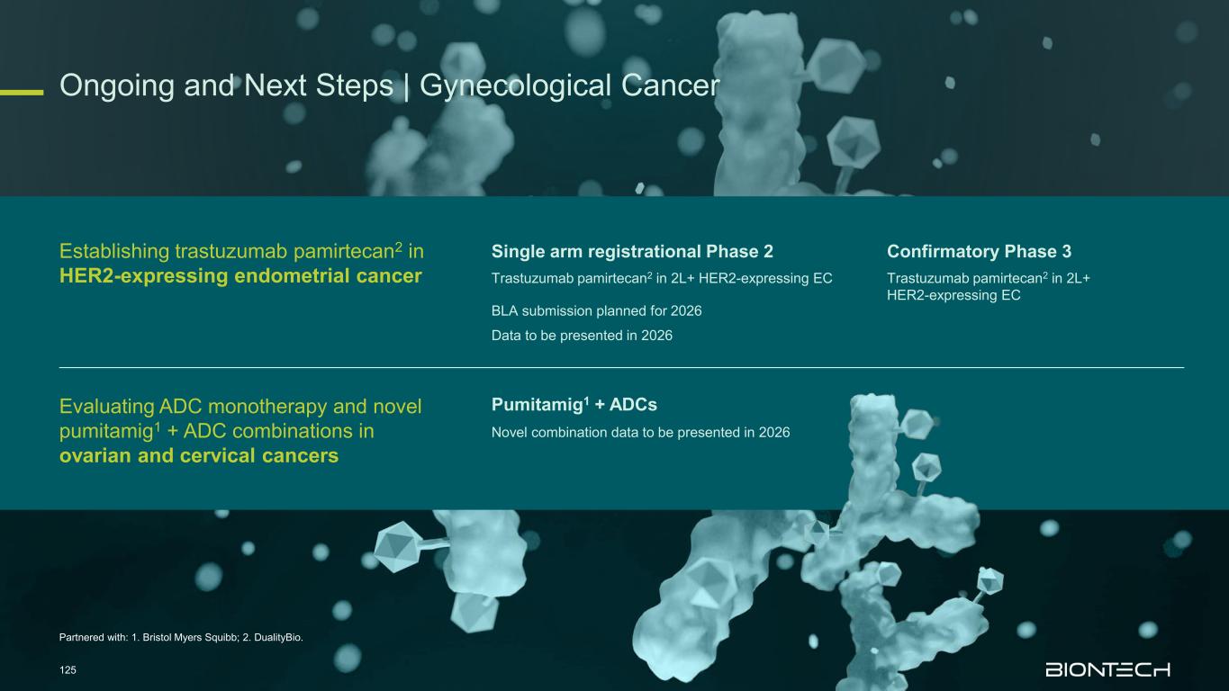 Partnered with: 1. Bristol Myers Squibb; 2. DualityBio. Ongoing and Next Steps | Gynecological Cancer Establishing trastuzumab pamirtecan2 in HER2-expressing endometrial cancer Evaluating ADC monotherapy and novel pumitamig1 + ADC combinations in ovarian and cervical cancers Pumitamig1 + ADCs Novel combination data to be presented in 2026 125 Single arm registrational Phase 2 Trastuzumab pamirtecan2 in 2L+ HER2-expressing EC Confirmatory Phase 3 Trastuzumab pamirtecan2 in 2L+ HER2-expressing EC BLA submission planned for 2026 Data to be presented in 2026