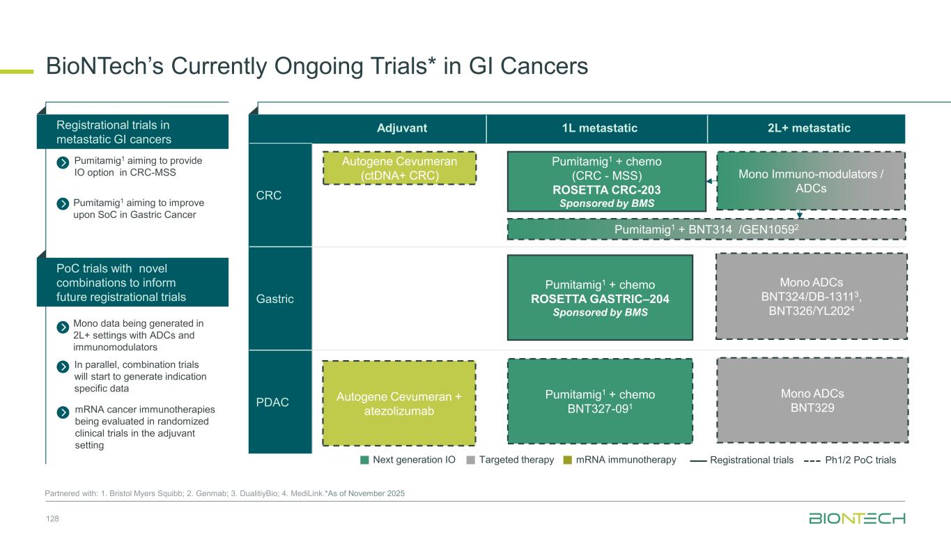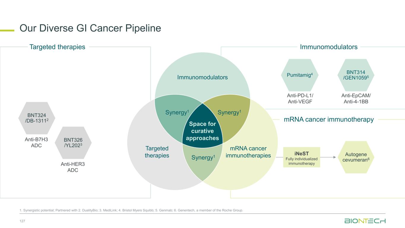 Anti-PD-L1/ Anti-VEGF Pumitamig4 Autogene cevumeran6 Immunomodulators mRNA cancer immunotherapy Our Diverse GI Cancer Pipeline 127 1. Synergistic potential; Partnered with 2. DualityBio; 3. MediLink; 4. Bristol Myers Squibb; 5. Genmab; 6. Genentech, a member of the Roche Group. Targeted therapies iNeST Fully individualized immunotherapy BNT314 /GEN10595 Anti-EpCAM/ Anti-4-1BB BNT326 /YL2023 Anti-HER3 ADC BNT324 /DB-13112 Anti-B7H3 ADC Immunomodulators Space for curative approaches Synergy1 Targeted therapies mRNA cancer immunotherapies Synergy1Synergy1