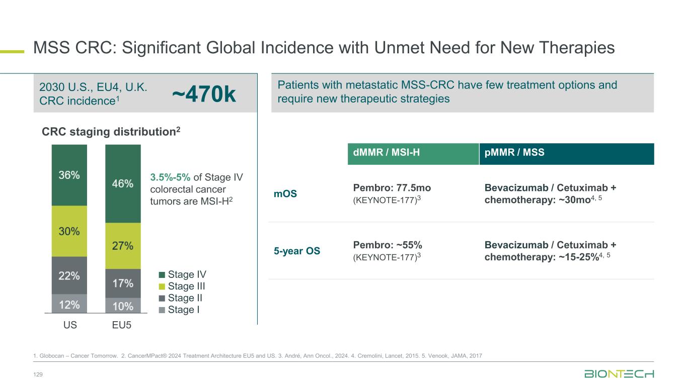 Patients with metastatic MSS-CRC have few treatment options and require new therapeutic strategies MSS CRC: Significant Global Incidence with Unmet Need for New Therapies 129 1. Globocan – Cancer Tomorrow. 2. CancerMPact® 2024 Treatment Architecture EU5 and US. 3. André, Ann Oncol., 2024. 4. Cremolini, Lancet, 2015. 5. Venook, JAMA, 2017 ~470k 2030 U.S., EU4, U.K. CRC incidence1 7% 8% 10% 11% 37% 44% 46% 37% US EU5 dMMR / MSI-H pMMR / MSS mOS Pembro: 77.5mo (KEYNOTE-177)3 Bevacizumab / Cetuximab + chemotherapy: ~30mo4, 5 5-year OS Pembro: ~55% (KEYNOTE-177)3 Bevacizumab / Cetuximab + chemotherapy: ~15-25%4, 5 3.5%-5% of Stage IV colorectal cancer tumors are MSI-H2 CRC staging distribution2 Stage II Stage III Stage IV Stage I