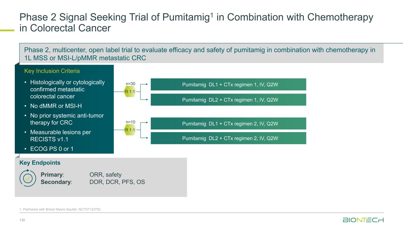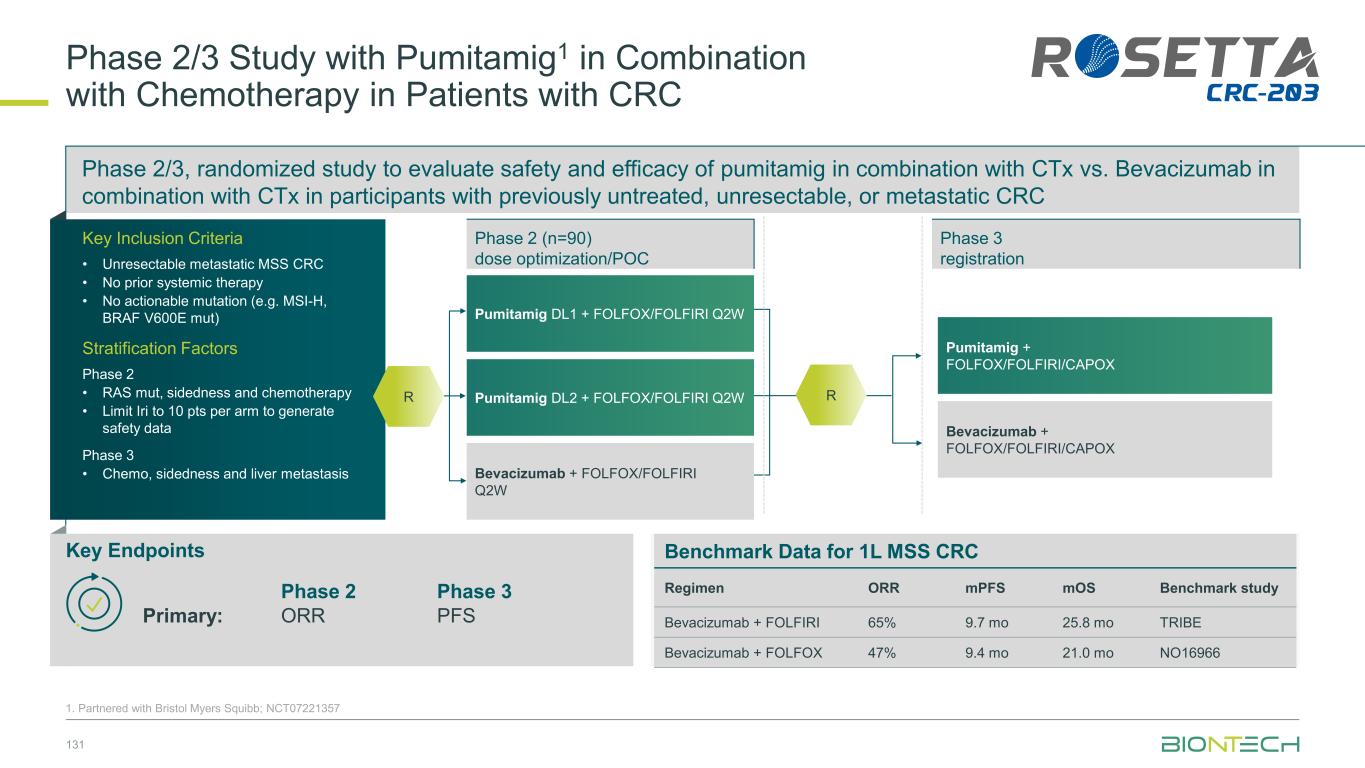 Phase 2, multicenter, open label trial to evaluate efficacy and safety of pumitamig in combination with chemotherapy in 1L MSS or MSI-L/pMMR metastatic CRC Phase 2 Signal Seeking Trial of Pumitamig1 in Combination with Chemotherapy in Colorectal Cancer 130 1. Partnered with Bristol Myers Squibb; NCT07133750 Key Endpoints Primary: ORR, safety Secondary: DOR, DCR, PFS, OS R 1:1 Pumitamig DL1 + CTx regimen 1, IV, Q2W Pumitamig DL2 + CTx regimen 1, IV, Q2W Key Inclusion Criteria • Histologically or cytologically confirmed metastatic colorectal cancer • No dMMR or MSI-H • No prior systemic anti-tumor therapy for CRC • Measurable lesions per RECISTS v1.1 • ECOG PS 0 or 1 R 1:1 n=30 n=10 Pumitamig DL1 + CTx regimen 2, IV, Q2W Pumitamig DL2 + CTx regimen 2, IV, Q2W