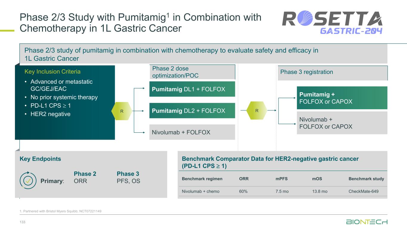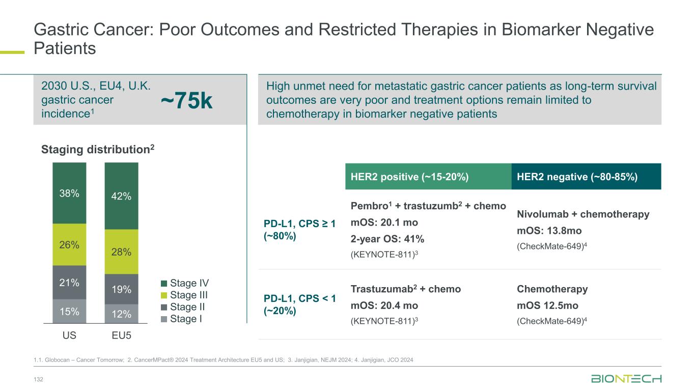 132 ~75k 2030 U.S., EU4, U.K. gastric cancer incidence1 1.1. Globocan – Cancer Tomorrow; 2. CancerMPact® 2024 Treatment Architecture EU5 and US; 3. Janjigian, NEJM 2024; 4. Janjigian, JCO 2024 Gastric Cancer: Poor Outcomes and Restricted Therapies in Biomarker Negative Patients 15% 12% 21% 19% 26% 28% 38% 42% US EU5 Staging distribution2 HER2 positive (~15-20%) HER2 negative (~80-85%) PD-L1, CPS ≥ 1 (~80%) Pembro1 + trastuzumb2 + chemo mOS: 20.1 mo 2-year OS: 41% (KEYNOTE-811)3 Nivolumab + chemotherapy mOS: 13.8mo (CheckMate-649)4 PD-L1, CPS < 1 (~20%) Trastuzumab2 + chemo mOS: 20.4 mo (KEYNOTE-811)3 Chemotherapy mOS 12.5mo (CheckMate-649)4 High unmet need for metastatic gastric cancer patients as long-term survival outcomes are very poor and treatment options remain limited to chemotherapy in biomarker negative patients Stage II Stage III Stage IV Stage I