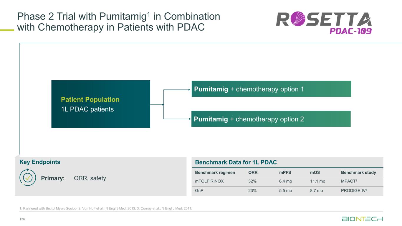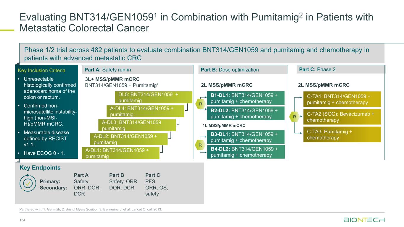 Phase 1/2 trial across 482 patients to evaluate combination BNT314/GEN1059 and pumitamig and chemotherapy in patients with advanced metastatic CRC 134 Partnered with: 1. Genmab; 2. Bristol Myers Squibb. 3. Bennouna J. et al. Lancet Oncol. 2013. Evaluating BNT314/GEN10591 in Combination with Pumitamig2 in Patients with Metastatic Colorectal Cancer Key Endpoints Key Inclusion Criteria • Unresectable histologically confirmed adenocarcinoma of the colon or rectum. • Confirmed non- microsatellite instability- high (non-MSI- H)/pMMR mCRC. • Measurable disease defined by RECIST v1.1. • Have ECOG 0 - 1. Part A Part B Part C Primary: Safety Safety, ORR PFS Secondary: ORR, DOR, DCR DOR, DCR ORR, OS, safety Part A: Safety run-in Part B: Dose optimization Part C: Phase 2 DL5: BNT314/GEN1059 + pumitamig A-DL4: BNT314/GEN1059 + pumitamig A-DL3: BNT314/GEN1059 pumitamig A-DL2: BNT314/GEN1059 + pumitamig A-DL1: BNT314/GEN1059 + pumitamig 3L+ MSS/pMMR mCRC BNT314/GEN1059 + Pumitamig* 2L MSS/pMMR mCRC B2-DL2: BNT314/GEN1059 + pumitamig + chemotherapy B1-DL1: BNT314/GEN1059 + pumitamig + chemotherapy R B3-DL1: BNT314/GEN1059 + pumitamig + chemotherapy 1L MSS/pMMR mCRC R B4-DL2: BNT314/GEN1059 + pumitamig + chemotherapy C-TA2 (SOC): Bevacizumab + chemotherapy C-TA1: BNT314/GEN1059 + pumitamig + chemotherapy C-TA3: Pumitamig + chemotherapy R 2L MSS/pMMR mCRC