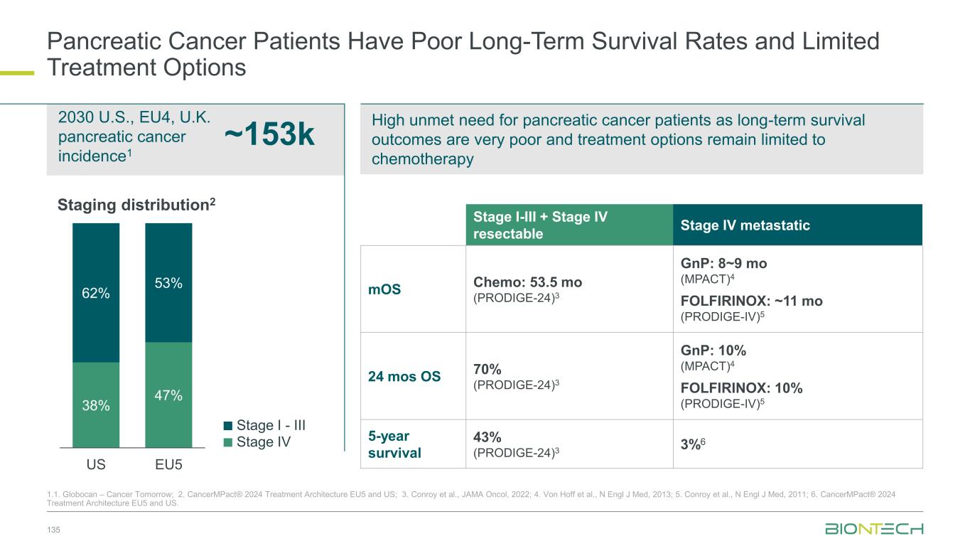 135 ~153k 2030 U.S., EU4, U.K. pancreatic cancer incidence1 1.1. Globocan – Cancer Tomorrow; 2. CancerMPact® 2024 Treatment Architecture EU5 and US; 3. Conroy et al., JAMA Oncol, 2022; 4. Von Hoff et al., N Engl J Med, 2013; 5. Conroy et al., N Engl J Med, 2011; 6. CancerMPact® 2024 Treatment Architecture EU5 and US. Pancreatic Cancer Patients Have Poor Long-Term Survival Rates and Limited Treatment Options 38% 47% 62% 53% US EU5 Staging distribution2 Stage I-III + Stage IV resectable Stage IV metastatic mOS Chemo: 53.5 mo (PRODIGE-24)3 GnP: 8~9 mo (MPACT)4 FOLFIRINOX: ~11 mo (PRODIGE-IV)5 24 mos OS 70% (PRODIGE-24)3 GnP: 10% (MPACT)4 FOLFIRINOX: 10% (PRODIGE-IV)5 5-year survival 43% (PRODIGE-24)3 3%6 High unmet need for pancreatic cancer patients as long-term survival outcomes are very poor and treatment options remain limited to chemotherapy Stage IV Stage I - III