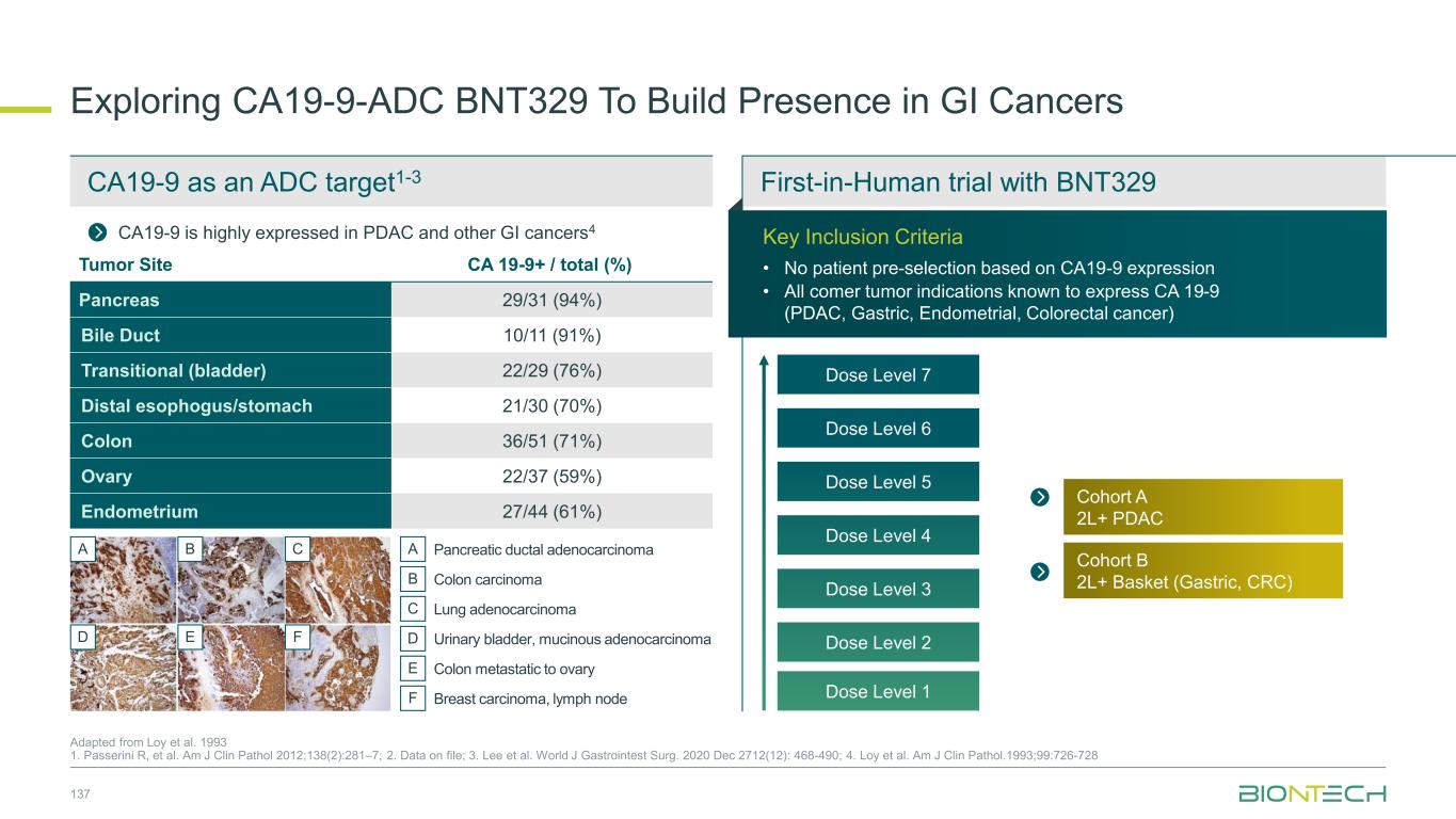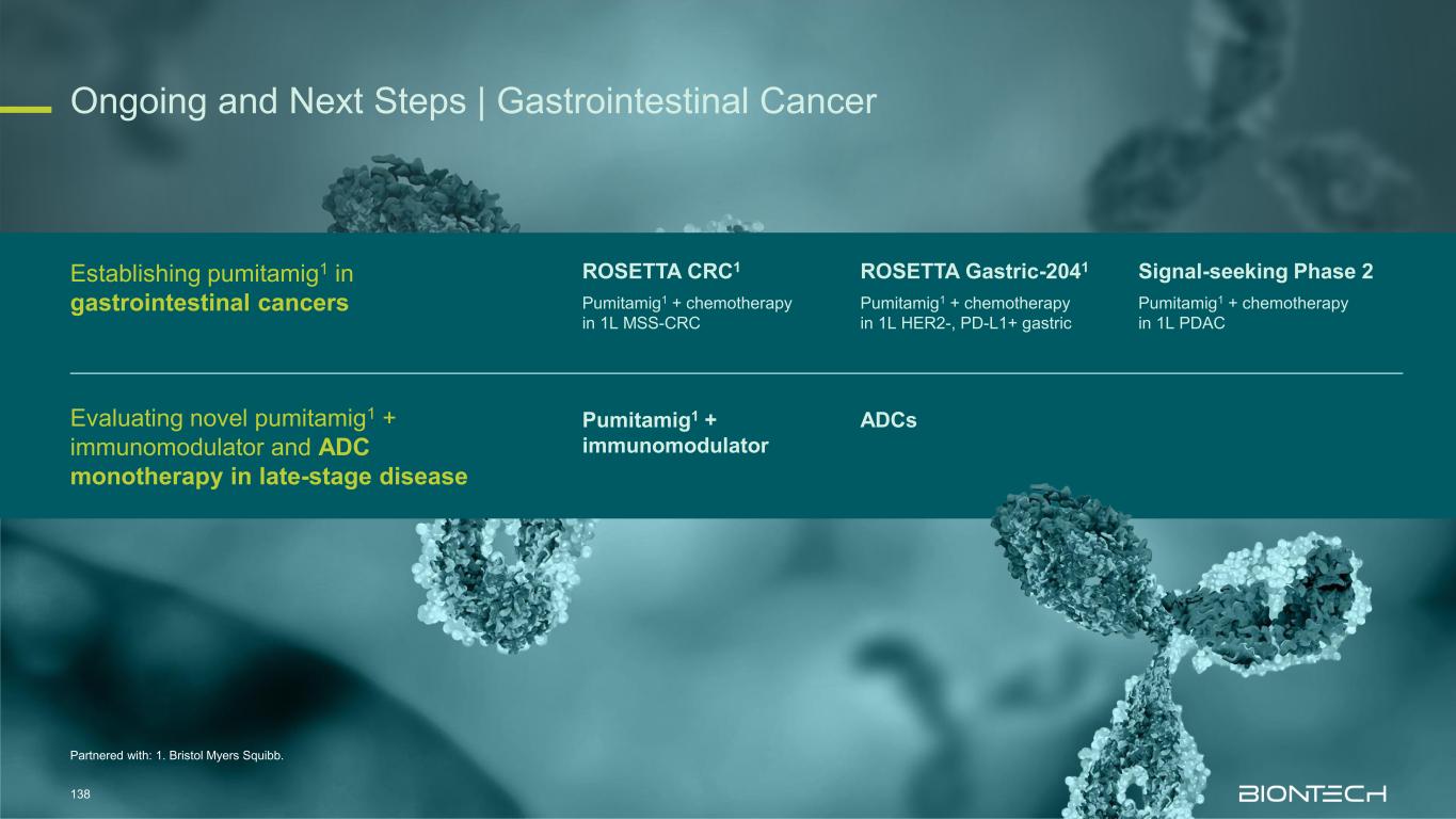 Exploring CA19-9-ADC BNT329 To Build Presence in GI Cancers 137 Adapted from Loy et al. 1993 1. Passerini R, et al. Am J Clin Pathol 2012;138(2):281–7; 2. Data on file; 3. Lee et al. World J Gastrointest Surg. 2020 Dec 2712(12): 468-490; 4. Loy et al. Am J Clin Pathol.1993;99:726-728 CA19-9 is highly expressed in PDAC and other GI cancers4 ExpansionDose escalation CA19-9 as an ADC target1-3 First-in-Human trial with BNT329 Key Inclusion Criteria • No patient pre-selection based on CA19-9 expression • All comer tumor indications known to express CA 19-9 (PDAC, Gastric, Endometrial, Colorectal cancer) Tumor Site CA 19-9+ / total (%) Pancreas 29/31 (94%) Bile Duct 10/11 (91%) Transitional (bladder) 22/29 (76%) Distal esophogus/stomach 21/30 (70%) Colon 36/51 (71%) Ovary 22/37 (59%) Endometrium 27/44 (61%) A B C D E F Pancreatic ductal adenocarcinomaA B C D E F Colon carcinoma Lung adenocarcinoma Urinary bladder, mucinous adenocarcinoma Colon metastatic to ovary Breast carcinoma, lymph node Dose Level 6 Dose Level 7 Dose Level 5 Dose Level 4 Dose Level 3 Dose Level 2 Dose Level 1 Cohort B 2L+ Basket (Gastric, CRC) Cohort A 2L+ PDAC