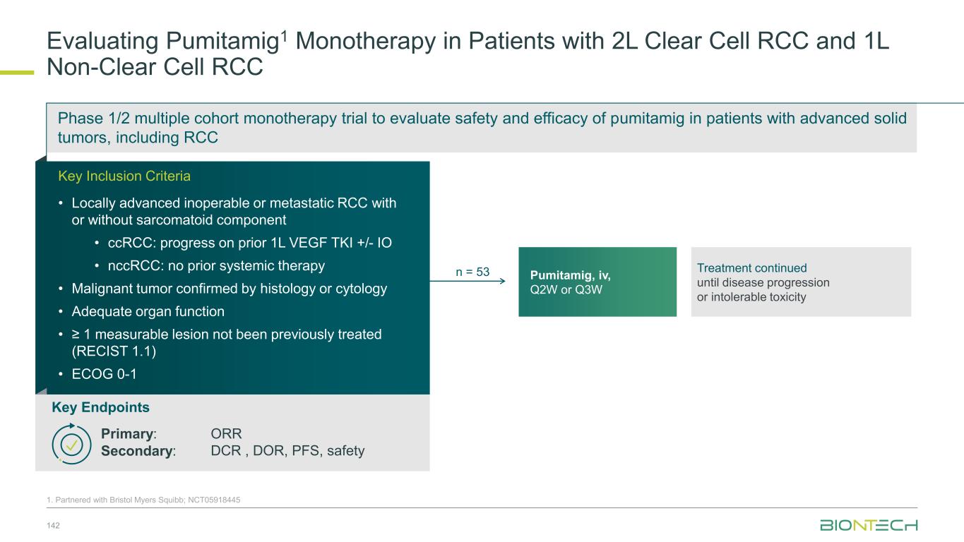 1L metastatic 2L+ metastatic RCC Prostate BioNTech’s Current Development in GU Cancer 141 Partnered with: 1. Bristol Myers Squibb; 2. DualityBio; 3. OncoC4. China Phase 1/2 pumitamig1 (non-clear cell) China Phase 1/2 pumitamig1 (clear cell) Immunomodulator + RLT (Gotistobart3) PoC trials in GU cancers to inform future registrational studies RCC: Pumitamig1 demonstrated encouraging efficacy as monotherapy in RCC Prostate: Encouraging data for BNT324/DB-13112 and gotistobart3 in late line mCRPC Ongoing trials will inform future registrational trials Next generation IO Targeted therapy mRNA immunotherapy Registrational trials Ph1/2 PoC trials ADC mono (BNT324/DB-13112)