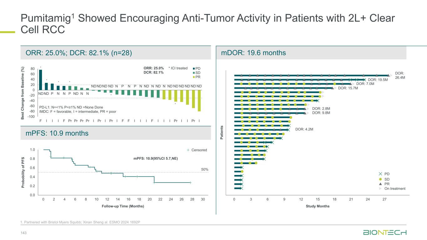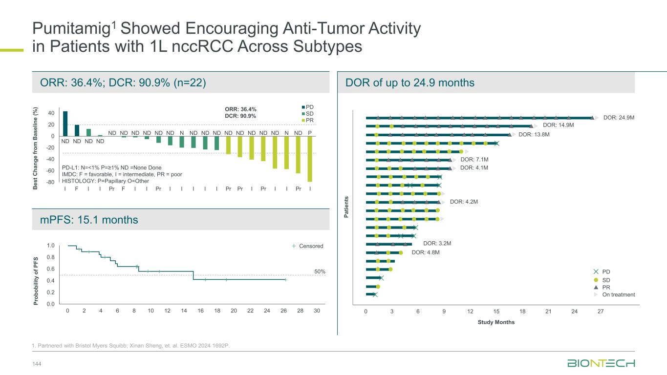 mPFS: 10.9 months Pumitamig1 Showed Encouraging Anti-Tumor Activity in Patients with 2L+ Clear Cell RCC 143 1. Partnered with Bristol Myers Squibb; Xinan Sheng al. ESMO 2024 1692P ORR: 25.0%; DCR: 82.1% (n=28) mDOR: 19.6 months P ro b o b il it y o f P F S 0.0 0.2 0.4 0.6 0.8 1.0 0 2 4 6 8 10 12 14 16 18 20 22 24 26 28 30 Follow-up Time (Months) 50% Censored mPFS: 10.9(95%CI 5.7,NE) 0 3 6 9 12 15 18 21 24 27 Study Months DOR: 26.4M DOR: 19.5M DOR: 7.0M DOR: 15.7M DOR: 2.8M DOR: 9.8M DOR: 4.2M P a ti e n ts PD SD PR On treatment B e s t C h a n g e f ro m B a s e li n e ( % ) -100 -80 -60 -40 -20 0 20 40 60 80 F I I I F Pr Pr Pr Pr I Pr I Pr I F F I I I F I I I Pr I I Pr I PD SD PR * * * * * * NDND P N N P ND N N NDNDND ND N P N P N ND N ND N ND ND ND ND ND ND PD-L1: N=<1% P=≥1% ND =None Done IMDC: F = favorable, I = intermediate, PR = poor * ICI treatedORR: 25.0% DCR: 82.1%