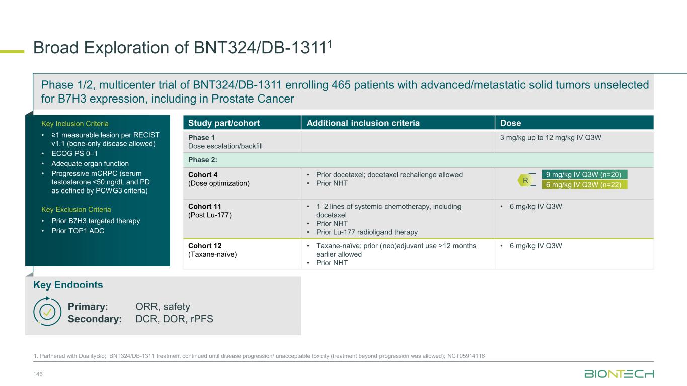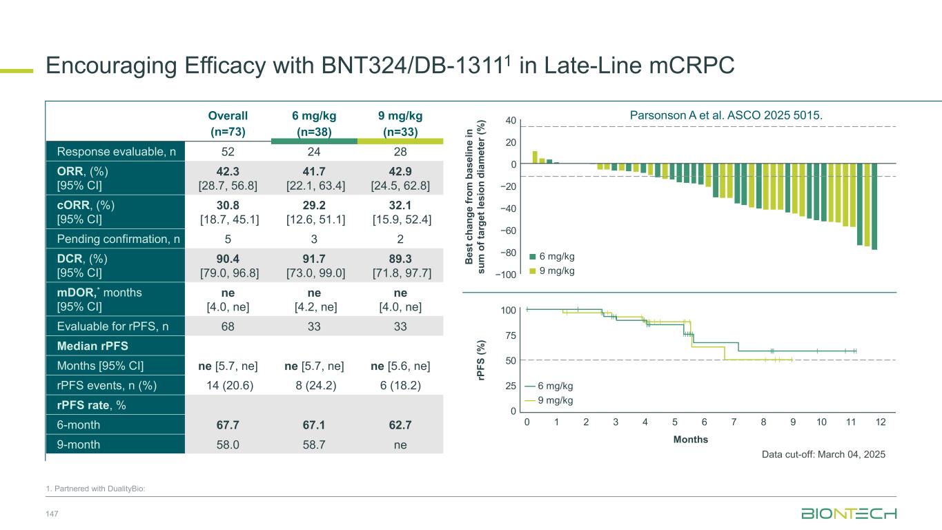 Phase 1/2, multicenter trial of BNT324/DB-1311 enrolling 465 patients with advanced/metastatic solid tumors unselected for B7H3 expression, including in Prostate Cancer Broad Exploration of BNT324/DB-13111 146 1. Partnered with DualityBio; BNT324/DB-1311 treatment continued until disease progression/ unacceptable toxicity (treatment beyond progression was allowed); NCT05914116 Key Endpoints Primary: ORR, safety Secondary: DCR, DOR, rPFS Key Inclusion Criteria • ≥1 measurable lesion per RECIST v1.1 (bone-only disease allowed) • ECOG PS 0–1 • Adequate organ function • Progressive mCRPC (serum testosterone <50 ng/dL and PD as defined by PCWG3 criteria) Key Exclusion Criteria • Prior B7H3 targeted therapy • Prior TOP1 ADC Study part/cohort Additional inclusion criteria Dose Phase 1 Dose escalation/backfill 3 mg/kg up to 12 mg/kg IV Q3W Phase 2: Cohort 4 (Dose optimization) • Prior docetaxel; docetaxel rechallenge allowed • Prior NHT Cohort 11 (Post Lu-177) • 1–2 lines of systemic chemotherapy, including docetaxel • Prior NHT • Prior Lu-177 radioligand therapy • 6 mg/kg IV Q3W Cohort 12 (Taxane-naïve) • Taxane-naïve; prior (neo)adjuvant use >12 months earlier allowed • Prior NHT • 6 mg/kg IV Q3W 6 mg/kg IV Q3W (n=22) 9 mg/kg IV Q3W (n=20) R