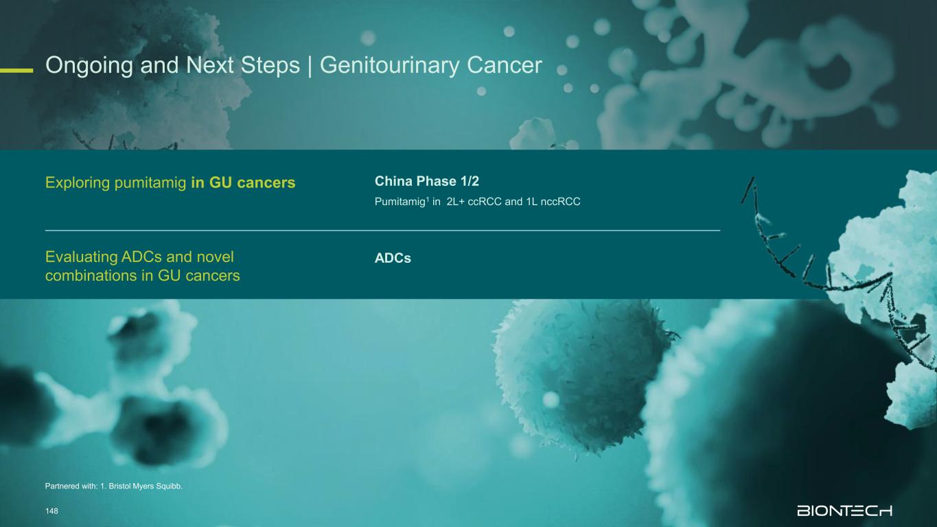 Partnered with: 1. Bristol Myers Squibb. Ongoing and Next Steps | Genitourinary Cancer Exploring pumitamig in GU cancers Evaluating ADCs and novel combinations in GU cancers ADCs China Phase 1/2 Pumitamig1 in 2L+ ccRCC and 1L nccRCC 148
