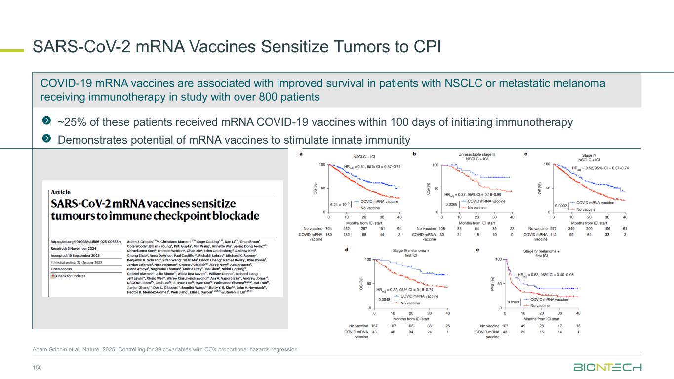 SARS-CoV-2 mRNA Vaccines Sensitize Tumors to CPI Adam Grippin et al, Nature, 2025; Controlling for 39 covariables with COX proportional hazards regression ~25% of these patients received mRNA COVID-19 vaccines within 100 days of initiating immunotherapy Demonstrates potential of mRNA vaccines to stimulate innate immunity COVID-19 mRNA vaccines are associated with improved survival in patients with NSCLC or metastatic melanoma receiving immunotherapy in study with over 800 patients 150