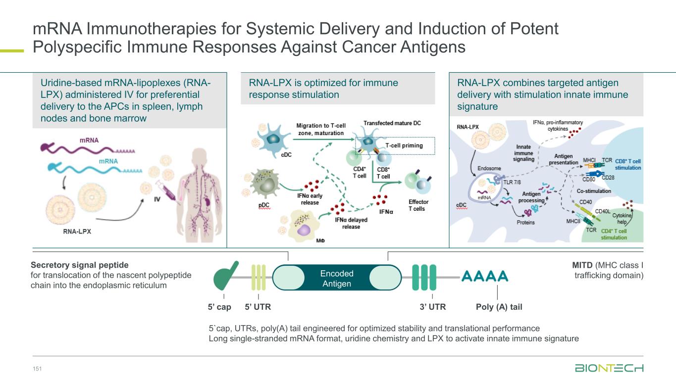 151 Uridine-based mRNA-lipoplexes (RNA- LPX) administered IV for preferential delivery to the APCs in spleen, lymph nodes and bone marrow RNA-LPX is optimized for immune response stimulation RNA-LPX combines targeted antigen delivery with stimulation innate immune signature Secretory signal peptide for translocation of the nascent polypeptide chain into the endoplasmic reticulum MITD (MHC class I trafficking domain)Encoded Antigen 5’ UTR5’ cap 3’ UTR Poly (A) tail 5`cap, UTRs, poly(A) tail engineered for optimized stability and translational performance Long single-stranded mRNA format, uridine chemistry and LPX to activate innate immune signature mRNA Immunotherapies for Systemic Delivery and Induction of Potent Polyspecific Immune Responses Against Cancer Antigens