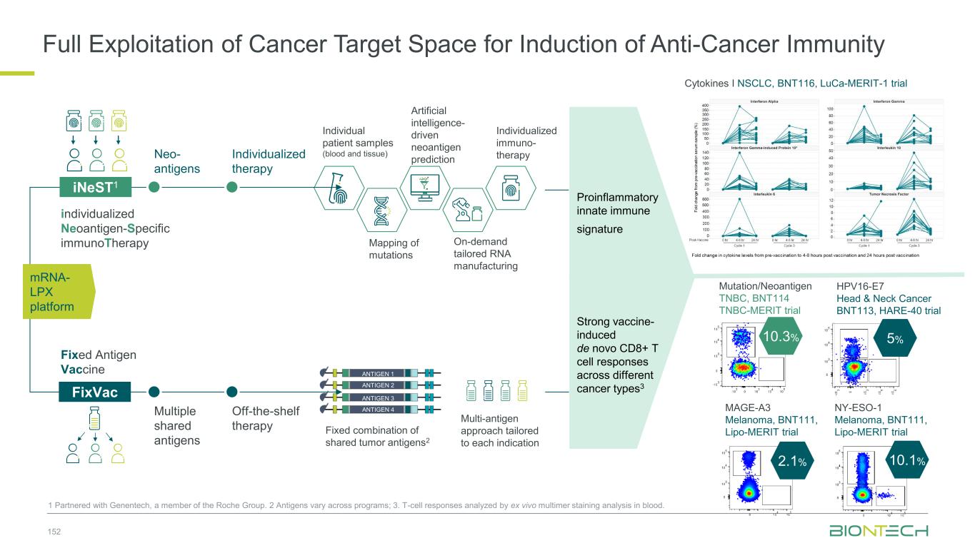 152 Individual patient samples (blood and tissue) Artificial intelligence- driven neoantigen prediction On-demand tailored RNA manufacturing Individualized immuno- therapy Mapping of mutations Fixed combination of shared tumor antigens2 Multi-antigen approach tailored to each indication Neo- antigens Individualized therapy Multiple shared antigens Off-the-shelf therapy iNeST1 FixVac individualized Neoantigen-Specific immunoTherapy Fixed Antigen Vaccine ANTIGEN 1 ANTIGEN 2 ANTIGEN 3 ANTIGEN 4 10.3% 10.1% HPV16-E7 Head & Neck Cancer BNT113, HARE-40 trial Mutation/Neoantigen TNBC, BNT114 TNBC-MERIT trial 5% MAGE-A3 Melanoma, BNT111, Lipo-MERIT trial 2.1% NY-ESO-1 Melanoma, BNT111, Lipo-MERIT trial mRNA- LPX platform Proinflammatory innate immune signature Strong vaccine- induced de novo CD8+ T cell responses across different cancer types3 1 Partnered with Genentech, a member of the Roche Group. 2 Antigens vary across programs; 3. T-cell responses analyzed by ex vivo multimer staining analysis in blood. Cytokines I NSCLC, BNT116, LuCa-MERIT-1 trial Full Exploitation of Cancer Target Space for Induction of Anti-Cancer Immunity
