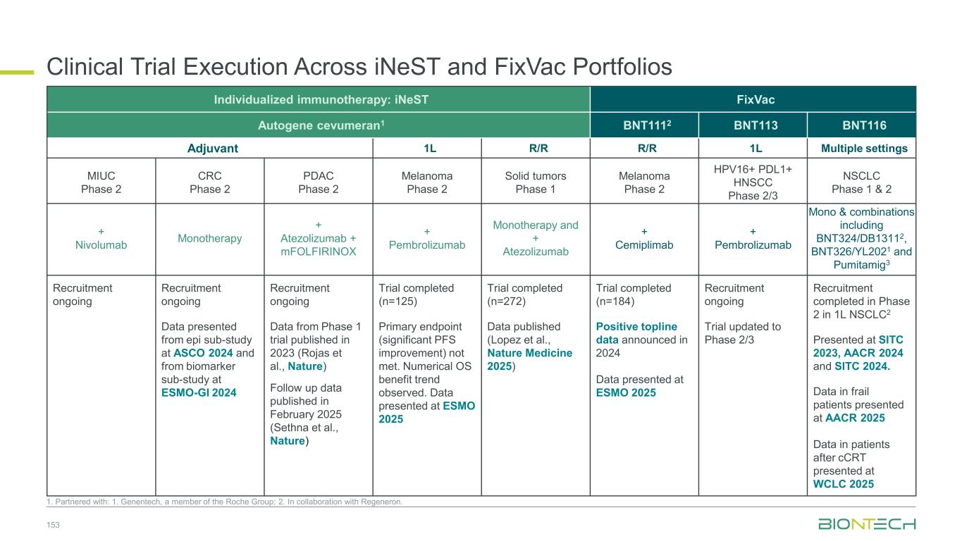 153 1. Partnered with: 1. Genentech, a member of the Roche Group; 2. In collaboration with Regeneron. Individualized immunotherapy: iNeST FixVac Autogene cevumeran1 BNT1112 BNT113 BNT116 Adjuvant 1L R/R R/R 1L Multiple settings MIUC Phase 2 CRC Phase 2 PDAC Phase 2 Melanoma Phase 2 Solid tumors Phase 1 Melanoma Phase 2 HPV16+ PDL1+ HNSCC Phase 2/3 NSCLC Phase 1 & 2 + Nivolumab Monotherapy + Atezolizumab + mFOLFIRINOX + Pembrolizumab Monotherapy and + Atezolizumab + Cemiplimab + Pembrolizumab Mono & combinations including BNT324/DB13112, BNT326/YL2021 and Pumitamig3 Recruitment ongoing Recruitment ongoing Data presented from epi sub-study at ASCO 2024 and from biomarker sub-study at ESMO-GI 2024 Recruitment ongoing Data from Phase 1 trial published in 2023 (Rojas et al., Nature) Follow up data published in February 2025 (Sethna et al., Nature) Trial completed (n=125) Primary endpoint (significant PFS improvement) not met. Numerical OS benefit trend observed. Data presented at ESMO 2025 Trial completed (n=272) Data published (Lopez et al., Nature Medicine 2025) Trial completed (n=184) Positive topline data announced in 2024 Data presented at ESMO 2025 Recruitment ongoing Trial updated to Phase 2/3 Recruitment completed in Phase 2 in 1L NSCLC2 Presented at SITC 2023, AACR 2024 and SITC 2024. Data in frail patients presented at AACR 2025 Data in patients after cCRT presented at WCLC 2025 Clinical Trial Execution Across iNeST and FixVac Portfolios