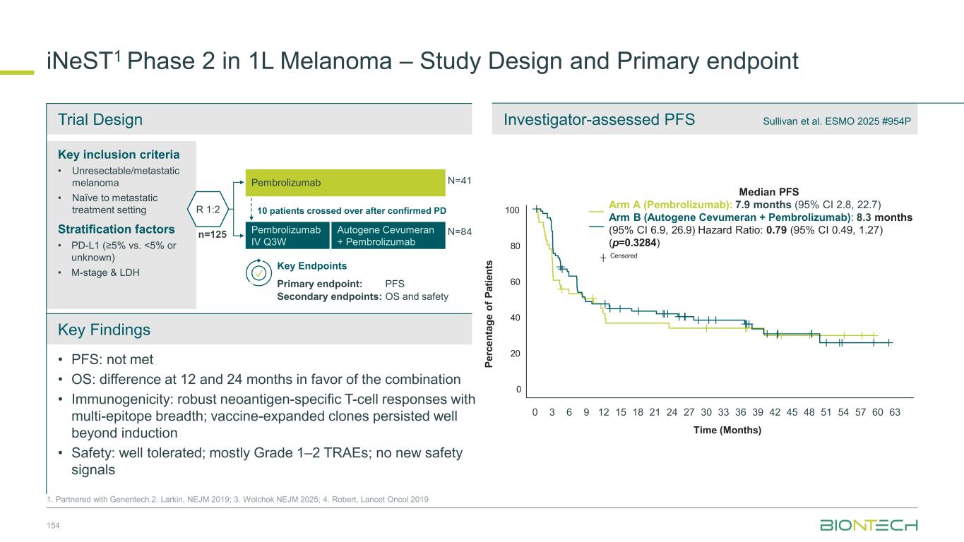 Key inclusion criteria • Unresectable/metastatic melanoma • Naïve to metastatic treatment setting Stratification factors • PD-L1 (≥5% vs. <5% or unknown) • M-stage & LDH Trial Design Investigator-assessed PFS Key Findings iNeST1 Phase 2 in 1L Melanoma – Study Design and Primary endpoint 154 1. Partnered with Genentech.2. Larkin, NEJM 2019; 3. Wolchok NEJM 2025; 4. Robert, Lancet Oncol 2019 • PFS: not met • OS: difference at 12 and 24 months in favor of the combination • Immunogenicity: robust neoantigen-specific T-cell responses with multi-epitope breadth; vaccine-expanded clones persisted well beyond induction • Safety: well tolerated; mostly Grade 1–2 TRAEs; no new safety signals N=41 Key Endpoints P e rc e n ta g e o f P a ti e n ts Time (Months) 100 80 0 20 40 60 Censored 0 3 6 9 12 15 18 21 24 27 30 33 36 39 42 45 48 51 54 57 60 63 Median PFS Arm A (Pembrolizumab): 7.9 months (95% CI 2.8, 22.7) Arm B (Autogene Cevumeran + Pembrolizumab): 8.3 months (95% CI 6.9, 26.9) Hazard Ratio: 0.79 (95% CI 0.49, 1.27) (p=0.3284) R 1:2 n=125 Pembrolizumab Autogene Cevumeran + Pembrolizumab Pembrolizumab IV Q3W 10 patients crossed over after confirmed PD N=84 Sullivan et al. ESMO 2025 #954P Primary endpoint: PFS Secondary endpoints: OS and safety