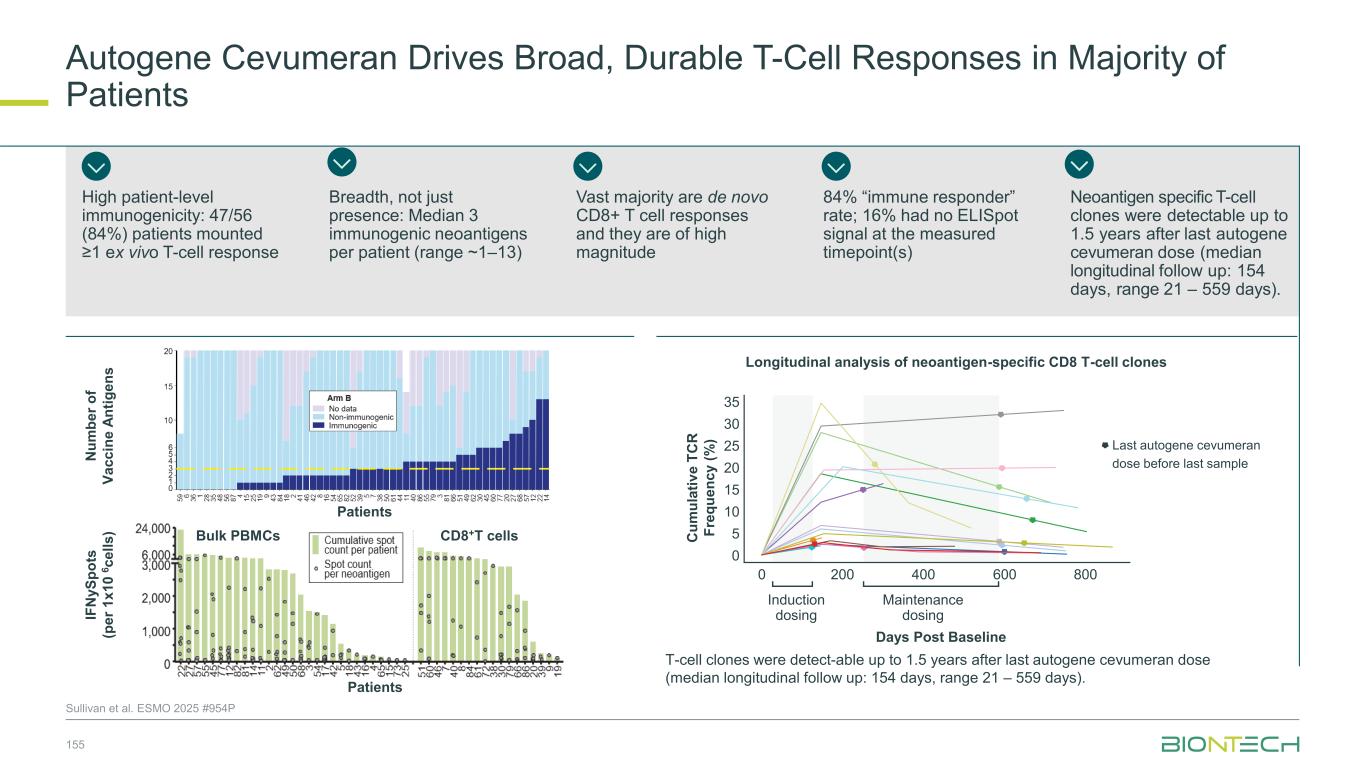 Bulk PBMCs CD8+T cells Patients Longitudinal analysis of neoantigen-specific CD8 T-cell clones Sullivan et al. ESMO 2025 #954P High patient-level immunogenicity: 47/56 (84%) patients mounted ≥1 ex vivo T-cell response N u m b e r o f V a c c in e A n ti g e n s IF N y S p o ts (p e r 1 x 1 0 6 c e ll s ) Patients Breadth, not just presence: Median 3 immunogenic neoantigens per patient (range ~1–13) Vast majority are de novo CD8+ T cell responses and they are of high magnitude 84% “immune responder” rate; 16% had no ELISpot signal at the measured timepoint(s) Neoantigen specific T-cell clones were detectable up to 1.5 years after last autogene cevumeran dose (median longitudinal follow up: 154 days, range 21 – 559 days). C u m u la ti v e T C R F re q u e n c y ( % ) Days Post Baseline 35 30 25 20 15 10 5 0 T-cell clones were detect-able up to 1.5 years after last autogene cevumeran dose (median longitudinal follow up: 154 days, range 21 – 559 days). 0 200 400 600 800 Induction dosing Maintenance dosing Last autogene cevumeran dose before last sample Autogene Cevumeran Drives Broad, Durable T-Cell Responses in Majority of Patients 155